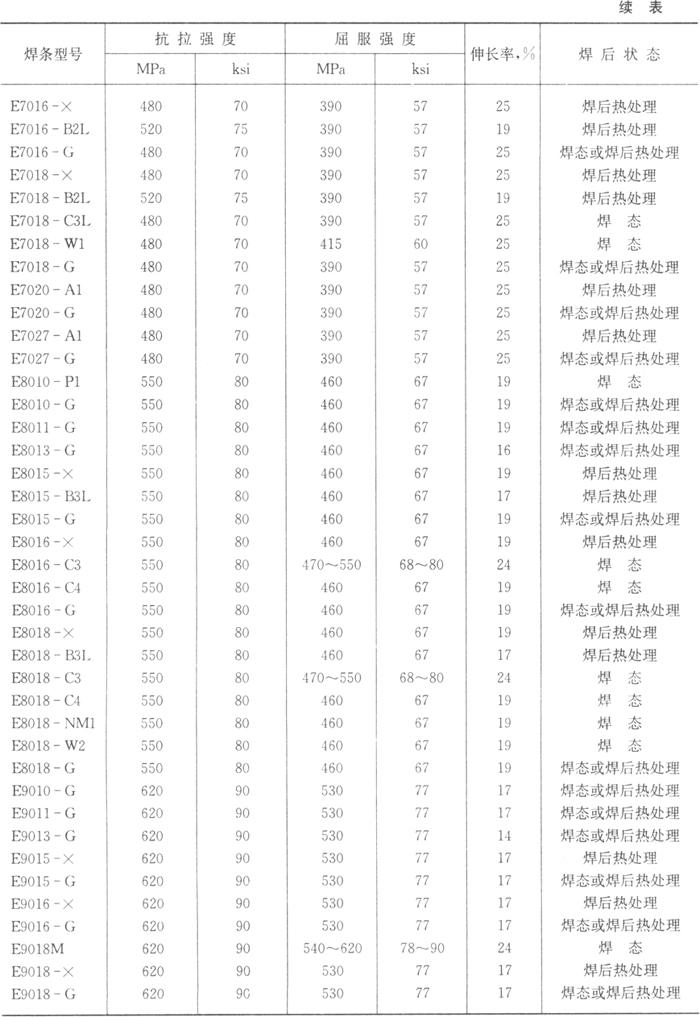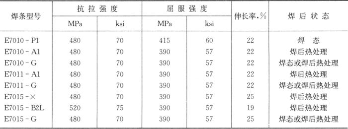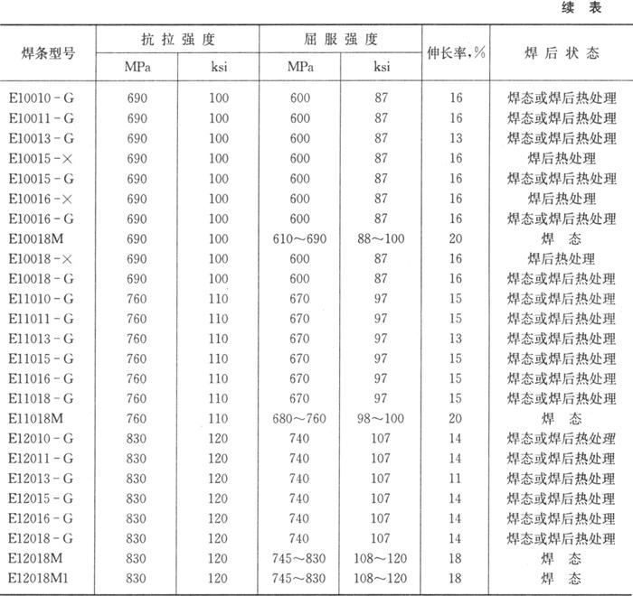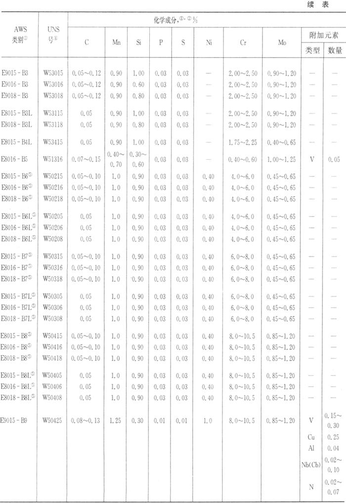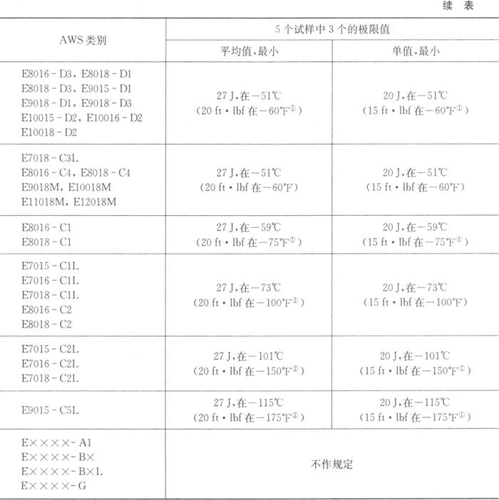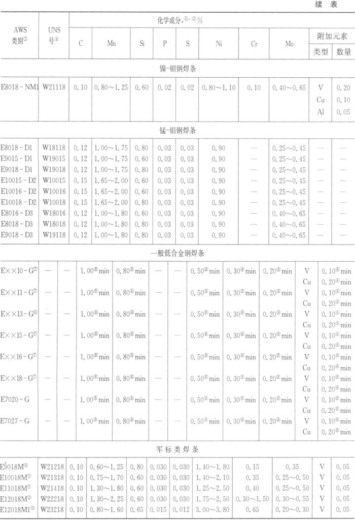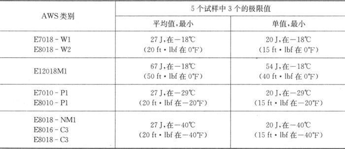 释义 | 美国手工电弧焊用低合金钢焊条标准概述 美国国家标准ANSI/AWS A5.5-1996《手工电弧焊用低合金钢焊条标准》为美国焊接学会在1996年颁布的。此标准规定了对手工电弧用低合金钢焊条的分类要求。焊条中的单个合金元素含量均不超过10.5%。美国标准低合金钢焊条的分类系统遵循AWS填充金属标准中采用的标准模式,其型号同样根据熔敷金属的力学性能、焊接位置、药皮类型、电流种类和化学成分划分。型号中,字母“E”及随后紧跟的数字及第一个短划“-”后的字母所表示的涵义基本同我国国家标准GB/T 5118。但美国低合金钢焊条型号中仅有一个短划“-”,不像GB/T5118中规定的若有附加化学成分要求时,附加化学成分直接用元素表示,并以第二个短划“-”与第一个短划“-”后面的字母分开。 美国低合金钢焊条标准包括分类为E××××-G的填充金属(在GB/T 5118中亦有此型号)。“G”表示填充金属为一般类别,但在某个方面(如化学成分)不同于所有其他类别的填充金属,仍可按标准分类。其目的是让有用的填充金属在现有的标准下能够分类,否则不符合标准,或需等待修改标准。而这样会导致符合标准的两种带有同一“G”的填充金属,在某个方面(如化学成分)可能完全不同。 表2.2-8列出了美国低合金钢焊条药皮类型、焊接位置及焊接电流类型,表2.2-9列出未经稀释焊缝金属的化学成分要求,表2.2-10和表2.2-11为焊缝金属焊态或焊后热处理状态的拉伸试验和夏比V型缺口冲击要求。由于我国GB/T 5118标准基本上等效采用美国AWS A5.5标准,所以大部分低合金钢焊条的型号(类别)是一致的,包括熔敷金属化学成分和力学性能等。但有一些型号是我国标准中所特有的,如E5515-B2-V和E5515-B3-VWB等,另有一些型号(类别)在AWS A5.5标准中有,而GB/T 5118中则尚未列入,如AWS E8015-B6、B8015-B8和B9015-B9等,两种标准的对照可参阅表2.2-14国内外低合金钢电焊条型号对照表。 表2.2-8 美国低合金钢焊条药皮类型、焊接位置及焊接电流类型(ANSI/AWS A5.5-1996) 表2.2-9 未经稀释焊缝金属的化学成分要求(ANSI/AWS A5.5-1996) 注:①除非另有规定,单值均为最大值。 ②应对那些有规定值的元素进行焊缝金属化学分析,列出的无规定值的其他元素,如果是故意加入的,应报道。这些后面的非规定元素和所有其他非故意加入的元素总和,应不超过0.5%。 ③后缀Al,B3,C3等表示焊条类别的化学成分。 ④金属和合金的SAE/ASTM的统一编号系统。 ⑤E8015-B6和E8015-B6L焊条在AWS A5.4-81《耐蚀铬和铬镍钢药皮焊条标准》中原先分类为E502-15焊条。E8016-86和E8016-B6L在A5.4-81中原先分类为E502-16。E8018-B6和E8018-B6L在AWS A5.4-81中原先没有分类,但在E502成分范围内生产,带有本标准的E××18药皮。同样,E80××-B7(L)类别在A5.4-81中原先分类为E7Cr-××,E80××-B8(L)类别在A5,4-81中原先分类为E505-××。 ⑥对本表中的E××13-G,用于类别代号中的“××”代表焊缝金属的不同抗拉强度水平(80,90,100,110和120ksi)。 ⑦对本表中除E××13-G外的所有焊条,用于类别代号的“××”代表焊条的不同抗拉强度水平(70,80,90,100,110和120ksi)。 ⑧为了满足G组的合金要求,未经稀释的焊缝金属应至少有列于本表的一个元素的最低值,附加化学成分要求可在供需双方之间商定。 ⑨这些类别力求与MIL-E-22200/MIL-E-22200/10覆盖的焊条类型相类似。 ⑩在AWS A5.5-81中,E7018-W1代号为E7018-W,E8018-W1代号为E8018-W。 表2.2-10 焊缝金属的拉伸试验要求(ANSI/AWS A5.5-1996) 注:除另有规定外,单值为最小值。 表2.2-11 焊缝金属的冲击试验要求(ANSI/AWS A5.5-1996) 注:①这些类别在焊后热处理状态下试验。对所有其他类别的试样不应进行热处理。 焊条焊接时的预热、层间温度及焊后热处理温度基本上同GB/T 5118的要求.但B6、B8和B9的预热温度和层间温度分别为177~232℃、205~260℃和232~288℃,焊后热处理温度均为(740±14)℃。 |