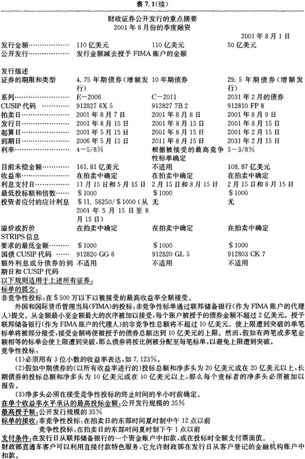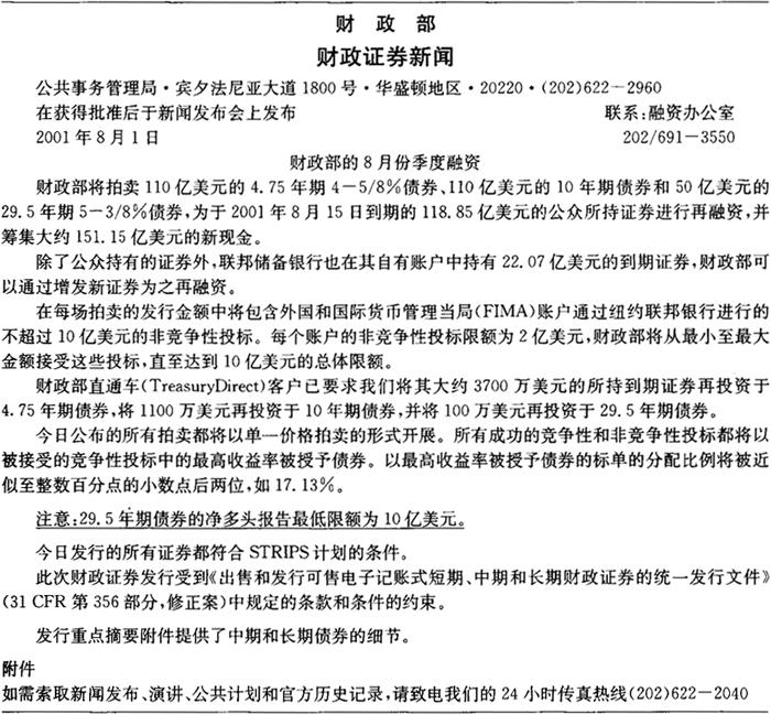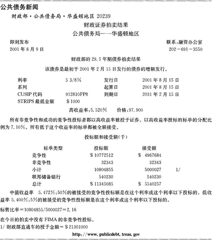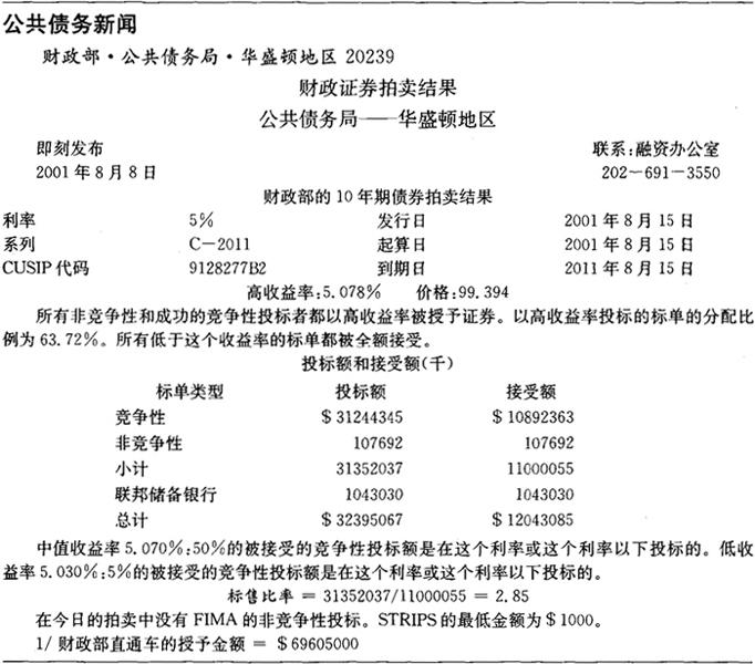 释义 | 美国财政证券 美国财政证券是财政部发行的美国政府直接债务。它们由美国政府的完全承诺和信用支持,因此被认为是没有信用风险的。以偿付到期债券和筹集所需现金为目的的财政证券发行已创建了于2001年6月30日总额达2.8万亿美元的可售财政证券存量。(2)财政证券在具有高度流动性的全天候二级市场中交易,交易十分活跃,买入/卖出差价也极小。尽管财政证券没有信用风险且流动性较高,但财政证券的投资者仍必须承担利率风险,希望将还款从美元转换为其当地货币的非美国投资者还暴露于汇率风险中。正如后面将解释的那样,一些财政证券消除了通货膨胀风险和再投资风险。 财政证券在金融市场中起到了数个重要的作用。由于其流动性和发展完善的衍生工具市场,财政证券被广泛用以为其他固定收益证券定价和对冲这些证券的头寸。利息收入的免交州和地方税也帮助使财政证券成为了受到机构和个人欢迎的投资资产。此外,由于其信用资质和庞大的供应量,财政证券是中央银行和其他金融机构的一项主要储备资产。 证券的类型 财政证券是以贴现证券或息票证券的形式发行的。贴现证券在到期时支付一笔固定的金额(叫做面值或票面值),并且期间不支付利息。贴现证券的名称由来是:它们是以低于面值的价格发行的,投资者获得的收益为面值与发行价格的差额。息票证券是以既定的利率发行的,它们每6个月支付一次利息,并且在到期时以票面值(或本金值)赎回。息票证券是以接近票面值的价格发行的,投资者获取的收益主要为在证券期限内收到的息票付款。 财政部以贴现证券的形式发行原始期限为一年或一年以下的证券。这些证券叫做财政票据(treasury bill)。财政部目前发行原始期限为13周(3个月)和26周(6个月)的票据以及各种期限的现金管理票据。2001年7月,财政部宣布它将开始发行期限为4周的票据。2001年6月30日,财政票据占2.8万亿美元的未偿可售财政证券中的6200亿美元(22%)。由于财政票据的期限小于一年,它们被看作是货币市场的一部分,并且在第六章中有所讨论。 原始期限在一年以上的证券是以息票证券的形式发行的。原始期限大于1年、但不超过10年的息票证券被称为中期财政债券(treasury note)。原始期限大于10年的息票证券被称为长期财政债券(treasury bond)。财政部目前发行期限为2年、5年和10年的中期财政债券。2001年10月,财政部暂停了30年期财政债券的发行。尽管一些未偿债券是可赎回的,但财政部自1984年起即未再发行新的可赎回财政证券。2001年6月30日,中期财政债券占未偿可售财政证券中的1.5万亿美元(52%),长期财政债券占6170亿美元(22%)。 1997年1月,财政部开始出售通货膨胀连动证券。财政部利用城镇消费者的消费价格指数按通货膨胀率调整这些证券的本金。半年度利息付款是按通货膨胀率调整的本金的一个固定比例,按通货膨胀率调整的本金在到期时得以偿付。2001年6月30日,财政部的通货膨胀连动中期和长期债券占未偿可售财政证券中的1290亿美元(5%)。由于第八章将详尽地讨论这些证券,本章的剩余部分将着重讨论名义(或固定利率)财政证券。 一级市场 可售财政证券是通过封闭式投标的单一价格(或统一价格)拍卖在一级市场出售的。每场拍卖是通过财政部的新闻发布或新闻发布会提前7天公布的。公告提供了发行细节,包括发行规模以及所发行的证券的期限和类型,并描述了一些拍卖规则和程序。表7.1显示了财政部于2001年8月1日发布的2001年8月的10年期债券拍卖的公告。 表7.1 财政部的拍卖公告 财政证券的拍卖是对所有主体开放的。投标金额必须为1000美元的倍数(最低金额为1000美元),标单被提交给联邦储备银行(或分行)或财政部的公共债务局(Bureau ofPublic Debt)。竞争性标单必须以收益率报价,并且一般必须在拍卖日的东部时间下午1点以前提交。非竞争性标单一般必须在拍卖日的中午12点以前提交。尽管大多数投标(或正式的出价购买)都是以电子方式提交的,但竞争性和非竞争性标单都可以用纸质文件提交。(3) 财政部接受100万美元(对票据而言)和500万美元(对息票证券而言)以下的所有非竞争性公众投标,并接受从最低的收益率(即最高价格)至足以覆盖发行规模(减去非竞争性投标的规模)的收益率的竞争性投标。被接受的最高收益率叫做截止收益率。所有被接受的(竞争性和非竞争性)投标都以截止收益率被授予证券。可接受的收益率没有上限,财政部不根据投标的力度扩大或缩小发行规模。 在历史上,财政部曾通过多重价格(或歧视性)拍卖进行证券的拍卖。在多重价格拍卖中,财政部仍接受从最低收益率至足以出售发行金额(减去非竞争性标单的金额)的收益率的标单。然而,被接受的标单是以其特定的投标收益率、而不是以截止收益率被授予债券的。非竞争性标单则以被接受的竞争性标单的加权平均收益率、而不是以截止收益率被授予证券。(4) 财政部在继拍卖截止时间下午1点后的一个小时内公布拍卖结果。公告结果包含截止收益率、相关的价格,以及恰好以截止收益率投标的投资者被授予的证券比例。公告内容还包括非竞争性投标的数量、标单收益率中值,以及标售比率。标售比率是公众投标的总额与公众被授予的证券总额的比率。中期债券和长期债券的公告还包含新证券的息票率。息票率被设定为