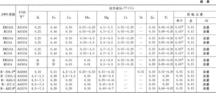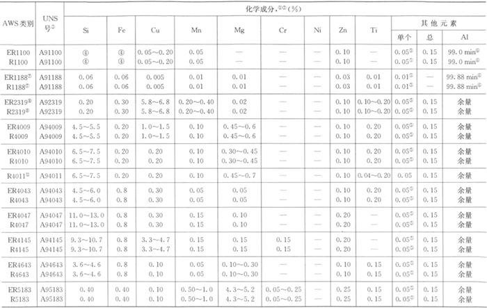 释义 | 美国铝和铝合金焊丝标准概述 美国标准ANSI/AWS A5.10/A 5.10M-1999《铝和铝合金焊丝和填充丝》规定了钨极气体保护焊、金属极气体保护焊、氧燃气焊和等离子弧焊用铝和铝合金焊丝及填充丝的分类要求。 美国标准中的铝合金焊丝和填充丝是根据填充金属的化学成分分类的,但同时还考虑到每个铝和铝合金焊丝所必须进行的分类试验,如焊丝还要求焊缝试板能通过射线检测,而填充丝则需要在平板上通过焊道试验。 在该标准中,焊丝的类别号用前缀字母“E”来表示,而填充的类别号则用“R”来表示,后面都跟四位数字。由于有些焊丝既可在金属极气体保护焊中作焊丝,又可在金属极气体保护焊、等离子弧焊中用作填充丝,故在四位数前同时采用两个前缀字母“ER”来表示,如ER5356,ER4043等。 表9.3-4列出了A5.10铝和铝合金焊丝和填充丝的化学成分要求。 表9.3-4 铝焊丝和填充丝的化学成分要求(ANSI/AWS A5.10/A5.10M-1999) 注:①应对本表中有规定值的元素进行分析。如分析时表明存在着其他元素,则应确定它们的含量,保证不超过的“其他元素”极限值。 ②除非另有规定,表中所列单个值为最大值。 ③金属和合金的SAE/ASTM统一编号体系。 ④硅加铁应不超过0.95%。 ⑤铍应不超过0.0008%。 ⑥非合金化铝的含铝量是100.00%与材料中存在不小于0.10%的其他金属元素总量(在确定总量前用第二位小数表示)之差值。 ⑦含钡量应不超过0.05%,含镓量应不超过0.03%。 ⑧含钡量应为0.05%~0.15%,含锆量应为0.10%~0.25%。 ⑨硅加铁应不超过0.45%。 ⑩含锡量应不超过0.05%。 ⑾含铍量应为0.04%~0.07%。 比较我国铝和铝合金焊丝及美国铝焊丝和填充丝的标准来看,两个标准的基本类别(型号)是一致的。在我国GB/T 10858-1989标准中有铝锰焊丝,而在美国AWS A5.10-1999标准中则没有。 在美国标准中有七种铝硅焊丝,而我国只有四种。两种标准焊丝的对照见表9.3-5。 表9.3-5 两种标准焊丝的对照 |