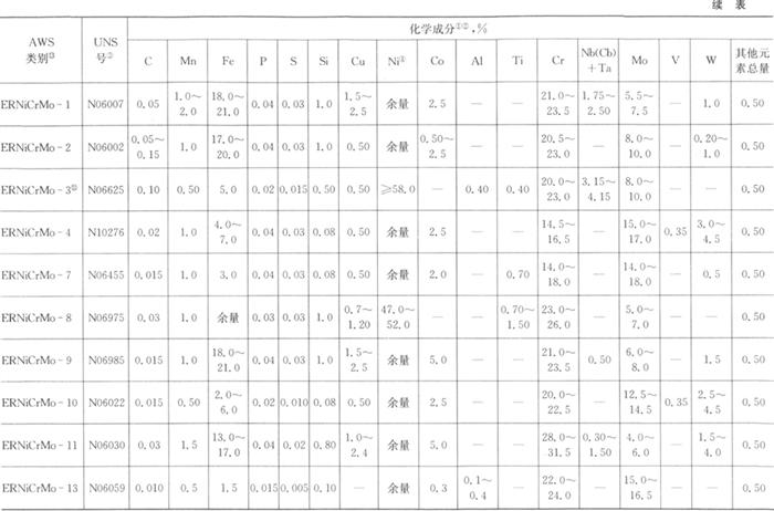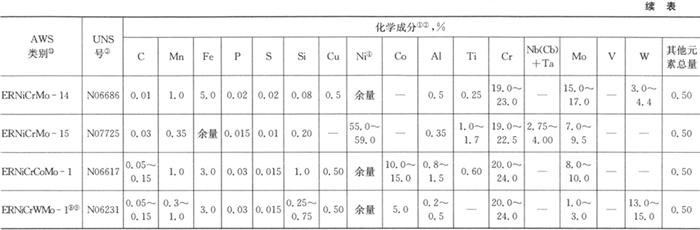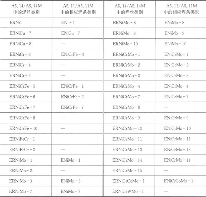 释义 | 美国镍及镍合金焊丝标准概述 美国AWS A5.14/A5.14M-1997《镍及镍合金光填充丝和焊丝标准》规定了镍及镍合金光填充丝、带极和焊丝的分类要求。它包括其成分中的含镍量均超过任何其他元素的焊丝,按填充金属的化学成分进行分类,见表5.3-3的规定。 表5.3-3 镍和镍合金填充丝及焊丝化学成分要求(AWS A5.14/A5.14M-1997) 注:①应对表中给出规定数值的元素进行分析,如在常规分析中表明存在其他元素,应作进一步分析,以确定那些元素的总量不超过表中最后一栏“其他元素总量”所规定的极限值。 ②除非另有规定,表中的单个值为最大值。 ③SAE/ASIM金属和合金的统一编号体系。 ④包括伴随的钴。 ⑤如买方规定的话,铝的含量不超过0.12%。 ⑥Mil-E-21562E型,钽的含量不超过0.30%。 ⑦硼的含量最大值为0.006%。 ⑧硼的含量最大值为0.003%。 ⑨镧的含量最大值为0.050%。 ⑩Al+Ti的含量最大值为1.5%。 ⑾Mil-E-21562E型,Pb<0.010,“其他元素总量”应包括铅、锡、锌。 ⑿当规定为EN82H或RH82日时,硫是0.03~0.10。 ⒀对带极,类别号“R”应用“Q”替代。 ⒁Ni-Mo的含量为94.0%~98.0%,Ta的含量不大于0.02%,Zr的含量不大于0.10%。 从应用的观点出发,本标准中的大多数填充金属类别在ANSI/AWS A5.11/A5.11M《镍及镍合金药皮焊条标准》中有相应类别,表5.3-4列出了本标准中的焊丝类别在与.ANSI/AWS A5.11中相应药皮焊条类别的比较。 表5.3-4 类别的比较 从AWS A5.14/A5.14M-1997来看,在此版的标准中增加了许多新的类别如ERNiCu-8、ERNiCr-6、ERNiCrFe-7、ERNiCrFe-8、ERNiCrFe-10、ERNiMo-8、ERNiMo-9、ERNiMo-10、ERNiCrMo-10、ERNiCrMo-11、ERNiCrMo-13、ERNiCrMo-14、ERNiCrMo-15、ERNiCrCoMo-1和ERNiCrWMo-1等。除这些类别外,由于我国等效采用美国AWS标准,其余类别与我国标准GB/T 15620-1995完全相同。 |