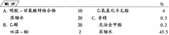 将A中的明胶-甘氨酸锌络合物分散于水。然后将其加入B中由3种组分混合成乳化液。在搅拌下,加入C中的香精和尼泊金甲酯溶于蒸馏水中的溶液,至完全混合均匀,即成产品。该面膜能促进皮肤再生,增加皮肤弹性和防皱。