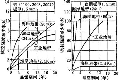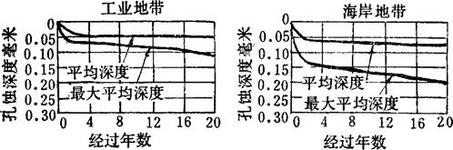 释义 | 耐气候性 (1)铝(合金)及软钢的大气暴露试验结果 图1-6 (2)美国的铝(合金)大气腐蚀试验结果 图1-7 (3)日本各地对铝合金进行10年大气暴露的腐蚀孔深度(单位:毫米) *:草酸防蚀膜9微米以上 |