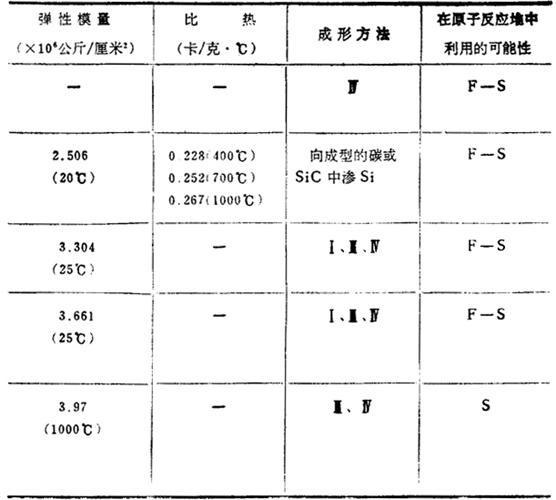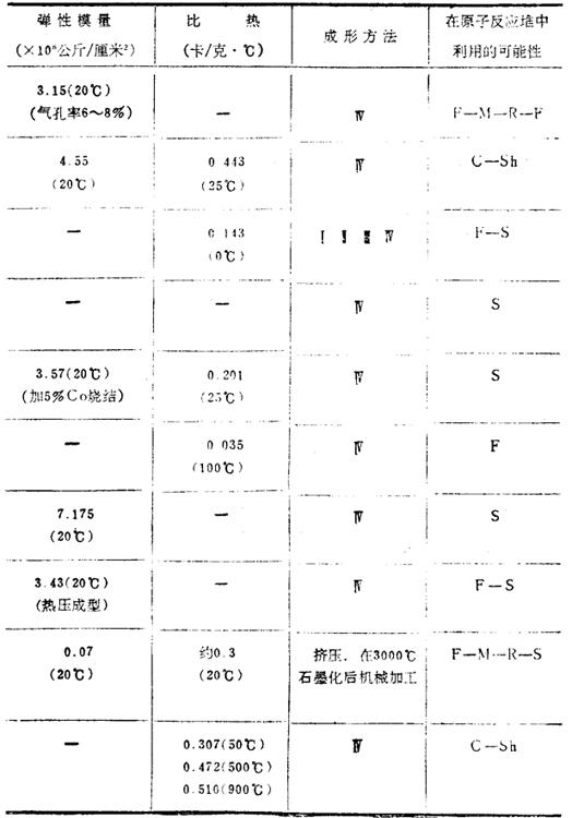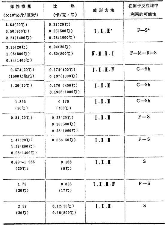释义 | 耐热材料的物理、核性质 *Ⅰ-注浆成形→烧结 Ⅱ-挤压成形→烧结 Ⅲ-常温加压成形→烧结 Ⅳ- S-构件 Sh-中子屏蔽材料。 高温加压成形(热压) F-裂变体材料 M-减速剂 R-反射板 C-控制材料 |