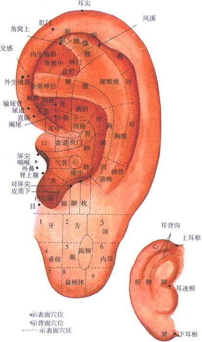 释义 | 耳针腧穴 人体发生疾病时,常会在耳廓的相应部位出现“阳性反应点”,如压痛、变形、变色、水疱、结节、丘疹、凹陷、脱屑、电阻降低点,这些反应点即耳针的刺激点,又称耳穴。耳针则是用针刺等手段刺激耳穴防治疾病的一种方法。 耳穴在耳廓的分布有一定规律,一般来说耳廓好像一个倒置的胎儿,头部朝下,臀部朝上。其分布的规律是:与头面部相应的穴位在耳垂(耳廓最下部,无软骨的皮垂)或耳垂附近;与上肢相应的穴位在耳舟(耳轮与对耳轮之间的凹沟);与躯干和下肢相应的穴位在对耳轮(在耳轮的内侧,与耳轮相对的隆起部)和对耳轮上、下脚(对耳轮上部有两分叉,其中位于上方的分叉称对耳轮上脚,位于下方的分叉称对耳轮下脚);与内脏相应的穴位多集中在耳甲艇(耳轮脚以上的耳腔部分)和耳甲腔(耳轮脚以下的耳腔部分);消化道在耳轮脚(耳廓最外侧缘的卷曲部分称耳轮,其深入至耳腔内的横行突起部分称耳轮脚)周围环形排列。其具体分布情况见图。 附:一、耳穴的针刺方法 根据疾病治疗需要选用短毫针或用图钉形揿针等。针刺时,左手固定耳廓,右手进针,深度以穿入软骨但不透过对侧皮肤为度。此外也有用磁珠、绿豆、菜子等用胶布固定,进行压迫刺激的。 毫针一般留针10~30分钟,痛症可留针1~2小时或更长。留针期间可间歇捻针。揿针用胶布固定后,春秋天可留针2~3天,冬天可留针7~10天,夏天不宜留针过长。留埋期间每天用手指按压揿针2~3次,每次1~3分钟,以加强刺激,提高疗效。急性病每天针刺1~2次,慢性病每天1次或隔天1次,连续治疗8~12次为一疗程,休息5~7天后再开始下一疗程。 二、常用耳穴的定位和主治 指Zhǐ(SF 1) 【定位】 在耳舟结节上方,耳舟的顶部。 【主治】 手指麻木疼痛等。 风溪(结节内)Fēngxī(SF 1.2i) 【定位】 指与腕两穴之间。 【主治】 荨麻疹、皮肤瘙痒症、哮喘。 腕Wàn(SF 2) 【定位】 指与肘两穴之间。 【主治】 相应部位的疼痛及功能障碍。 肘Zhǒu(SF 3) 【定位】 腕与肩两穴之间。 【主治】 相应部位的疼痛及功能障碍。 肩Jiān(SF 4-5) 【定位】 肘与锁骨两穴之间。 【主治】 相应部位的疼痛及功能障碍。 锁骨Suǒgǔ(SF 6) 【定位】 在轮屏切迹同水平的耳舟部。 【主治】 相应部位疼痛、肩周炎。 趾Zhǐ(AH 2) 【定位】 在对耳轮上脚外上角。 【主治】 足趾麻木、疼痛。 跟Gēn(AH 1) 【定位】 在对耳轮上脚的内上角。 【主治】 足跟痛。 踝Huái(AH 3) 【定位】 跟与膝两穴之间。 【主治】 踝部扭伤等相应部位的疼痛及功能障碍。 膝Xī(AH 4) 【定位】 在对耳轮上脚中部。 【主治】 相应部位的疼痛及功能障碍(如膝关节扭伤及关节炎等)。 髋Kuān(AH 5) 【定位】 在对耳轮上脚的下1/3处。 【主治】 相应部位的疼痛。 臀Tún(AH 7) 【定位】 在对耳轮下脚的外侧1/3处。 【主治】 相应部位的疼痛。 坐骨神经(坐骨)Zuògǔshénjīng(AH 6) 【定位】 在对耳轮下脚的内侧2/3处。 【主治】 坐骨神经痛。 交感(下脚端)Jiāogǎn(AH 6a) 【定位】 在对耳轮下脚前端与耳轮内侧交界处。 【主治】 内脏疼痛,心悸,自汗、盗汗等,自主神经功能紊乱,哮喘,痛经等。 耳中(膈)Erzhōng(HX 1) 【定位】 在耳轮脚处。 【主治】 呃逆,黄疸,皮肤病等。 直肠(直肠下段)Zhícháng(HX 2) 【定位】 与大肠穴同水平的耳轮处。 【主治】 便秘、脱肛,内外痔,里急后重。 尿道Niàodào(HX 3) 【定位】 与对耳轮下脚下缘相平的耳轮处。 【主治】 遗尿,尿频,尿急,尿痛。 外生殖器Wàishēngzhíqì(HX 4) 【定位】 与对耳轮下脚上缘相平的耳轮处。 【主治】 阳痿,外生殖器炎症,会阴部皮肤病。 肛门(尖前,痔核点)Gāngmén(HX 5) 【定位】 耳尖与上耳根穴之间。 【主治】 内、外痔。 耳尖Èrjiān(HX 6.7i) 【定位】 将耳廓向耳屏对折时,耳轮上方的尖端处。 【主治】 发热,高血压,外眼炎症,诸痛症。 颈椎Jìngzhuī(AH 13) 【定位】 自轮屏切迹到对耳轮上、下脚分叉处分为三等份,下1/3处。 【主治】 相应部位疼痛。 胸椎Xiōngzhuī(AH 11) 【定位】 自轮屏切迹到对耳轮上、下脚分叉处分为三等份,中1/3处。 【主治】 相应部位疼痛。 腰骶椎Yāodizhuī(AH 9) 【定位】 自轮屏切迹到对耳轮上、下脚分叉处分为三等份,上1/3处。 【主治】 相应部位疼痛。 颈Jìng(AH 12) 【定位】 颈椎的耳腔缘。 【主治】 落枕,斜颈等相应部位病证。 胸Xiōng(AH 10) 【定位】 胸椎的耳腔缘。 【主治】 胸闷、胸痛等相应部位病证。 腹Fǔ(AH8) 【定位】 腰骶椎的耳腔缘。 【主治】 腹部及妇科病证,腰痛。 神门Shénmén(TF 4) 【定位】 对耳轮上、下脚分叉处,三角窝的外侧1/3部。 【主治】 失眠,多梦,烦躁,炎症,哮喘,咳嗽,眩晕,荨麻疹,痛症。 内生殖器(子宫、精宫、天癸、三角凹陷)Nèishēngzhíqì(TF 2) 【定位】 在三角窝内,近耳轮中点的凹陷处。 【主治】 妇产科病证,阳痿,前列腺炎等。 角窝上(角上,降压点)Jiǎowōshàng(TF 1) 【定位】 在三角窝外上角。 【主治】 高血压。 角窝中(喘点)Jiǎowōzhōng(TF 3) 【定位】 在三角窝中1/3处。 【主治】 哮喘。 盆腔(腰痛点)Pénqiāng(TF 5) 【定位】 在三角窝内,对耳轮上、下角分叉处稍下方。 【主治】 盆腔炎。 外鼻(鼻)Wàibí(TG 1.2i) 【定位】 在耳屏外侧面中央。 【主治】 鼻疖,鼻炎。 屏尖(上屏尖)Píngjiān(TG 1p) 【定位】 耳屏上部隆起的尖端。 【主治】 炎症,疼痛性病症。 肾上腺(下