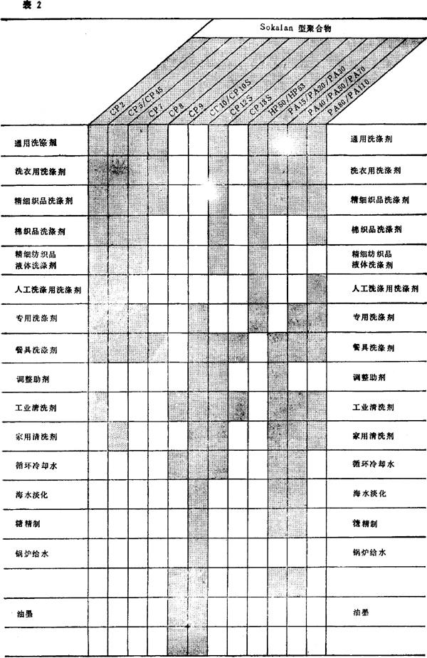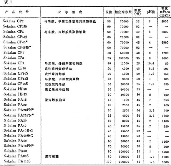 表1中,商品名称代号后缀“S”表示聚合酸呈游离酸状态,后缀“PN”表示聚合酸被部分中和,除Sokalan CP45的聚合酸也被部分中和外,所有其他Sokalan PA型和SokalanCP型产品中的聚合酸均全部被中和。