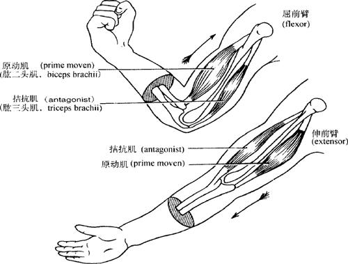 释义 | 肌的作用和作用形式 骨骼肌功能的表现是收缩,通过收缩而产生运动。肌的运动有两种:一种是静力工作,主要是维持躯体一定的姿势,使人体各部之间保持平衡,这一工作并不引起肢体的运动;另一种为动力工作,如行走、跑跳及生产劳动力等,可引起肢体的移位。不论哪一种运动,骨骼肌都是通过运动单位(motor unit)去实现。肌的运动单位是由一个运动神经元和它所支配的全部肌纤维共同组成(图3-13)。一个运动单位内的肌纤维数目之多少,取决于肌的功能和形态的大小。宽大的躯干肌和下肢肌,如臀大肌和小腿肌,一个神经元支配约160~1600个肌纤维;但做精细动作的手肌和眼肌,如眼外肌,其一个运动单位仅含6~12个肌纤维。在一般情况下,各肌均有部分的运动单位有序地处于收缩状态,使肌保持一定的肌力,称肌张力(muscular tone)。肌张力不产生动作,但对维持躯体各种姿势至关重要。当神经纤维被切断后,肌张力即消失。如下运动神经元(lower motor neuron)损伤时,临床上所见的软瘫(flaccia paralysis)或周围瘫(periodic paralysis)表现为受相应神经支配的肌肉肌张力降低,肌肉也因神经营养障碍而逐渐萎缩。 图3-13 肌运动单位(元)(motor unit)示意图 人体的任何一种动作极为多样复杂,均由一些肌或肌群等共同完成的。例如日常生活中的“写字”动作,尽管主要表现在手,但参与腕、肘、肩等关节运动的肌,据估计超过100块。然而,在各种动作中,各肌所起的作用不尽相同。如屈肘关节时,是由肱二头肌(biceps brachii)和肱肌(brachialis)发动的,称为原动肌(prime mover);与原动肌相反作用的肱三头肌(triceps brachii)则为拮抗肌(antagonist)。在完成有效的伸肘关节运动中,这两组肌的作用是对抗的,但又是互相统一的。如日常生活中持杯饮水,先是伸肘关节,紧接着屈肘关节,伸肌和屈肌都在起作用,而且在一定条件下原动肌与拮抗肌是可以互相转化的(图3-14)。 图3-14 原动肌与拮抗肌在不同作用情况下功能的互相转化示意图(箭头示肘关节运动方向) 人体运动时为了使原动肌工作更有效,有些肌或肌组织起到固定的作用,这些肌被称为固定肌(fixator)。如屈肘关节时,止于肩胛骨的斜方肌(trapezius)、菱形肌(rhomboideus muscle)等起到固定该骨的作用。此外,尚有协同肌(synerist)或合作肌,是指配合原动肌更好工作的肌组,并随原动肌一起收缩而产生相同的功能。如尺侧腕屈肌(flexor carpi ulnaris)、尺侧腕伸肌(extensor carpi ulnaris),腕关节内收时协同肌,但在伸或屈腕关节时却是拮抗肌。协同肌与拮抗肌是肌功能与分布的普遍规律,它们在神经系统支配调节下既矛盾又统一,相辅相成以维持正常人体的各种有效的生理功能。在此值得注意的是,人生活在地球上,无时不受重力(gravity)即地心引力的影响。这种人们不易感觉到的外力,在与人体平行的上肢屈肘时,是屈肌的拮抗力;伸肘时,它又转化为伸肘的原动力。必须记住地心引力对肌功能的影响,了解肌的作用对临床实践有重要的意义。 运动系统工作尤如杠杆(levers)装置,一般有三种形式(图3-15): 图3-15 肌肉运动杠杆示意图(A~C) (1)平衡杠杆(equilibrium lever):其支点在重点和力点之间,如寰枕关节(atlantoccipital joint)进行的俯头和仰头运动。 (2)省力杠杆(save effort lever):其重点位于支点和力点之间,如踝关节(ankle joint)或距小腿关节在为起足跟向上时的运动。 (3)速度杠杆(velosity lever):其力点在重点与支点之间,如肘关节(elbow joint)在举起重物时的运动。 |