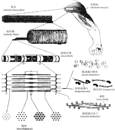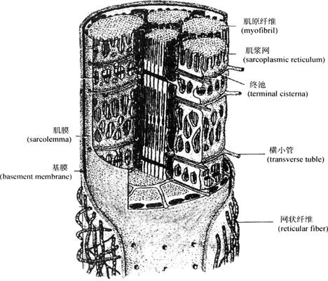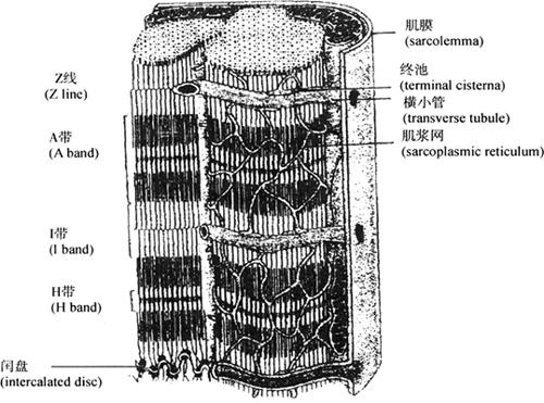 释义 | 肌组织 肌组织(muscle tissue)由具有收缩能力的肌细胞组成。肌细胞间有少量结缔组织。肌细胞呈细长纤维状,又称肌纤维(muscle fiber),肌纤维的细胞膜称肌膜(sarcolemma),胞浆称肌浆(sarcoplasm),内含大量肌原纤维(myofibril),它们是肌细胞收缩功能的形态基础。肌纤维的滑面内质网称为肌浆网(sarcoplasmic reticulum)。 根据肌组织的形态结构和功能不同,可分为三类:骨骼肌(skeletal muscle)、心肌(cardiac muscle)和平滑肌(smooth muscle)。骨骼肌纤维和心肌纤维都有明暗相间的横纹,属横纹肌(striated muscle);而平滑肌纤维无横纹,主要分布于内脏和血管壁。 (一)骨骼肌 1.骨骼肌纤维的一般结构 骨骼肌附着于骨骼上,其活动受意识支配,故也称随意肌(voluntary muscle)。它们是由许多平行排列的骨骼肌纤维(skeletal muscle fibres)和结缔组织及分布其中的血管、神经等组成。骨骼肌纤维呈长圆柱状,长短不一,约1~40mm,直径约10~100μm;细胞核多,呈扁平或扁椭圆形位于细胞周边近细胞膜处(图2-38)。肌浆内含有许多与细胞长轴平行排列的肌原纤维,还有大量线粒体、滑面内质网、糖原等。 图2-38 骨骼肌纤维的结构(A、B) 肌原纤维(myofibril):每条肌原纤维有由明带(light band)和暗带(dark band)相间排列的横纹(cross striation)。由于各肌原纤维的明暗横纹都相应排列在同一平面上,使整个肌纤维上显示明暗相间的横纹。明带着色较浅,呈单折光(各向同性,isotropic),称Ⅰ带;暗带着色较深,呈双折光(各向异性,anisotropic),称A带。A带中间有一浅带称H带(hensen band),在H带中还有一深色线称M线(M line)。在Ⅰ带正中央有一深色线称Z线(Z line)。相邻两Z线之间的一段肌原纤维称为肌节(sarcomere),它包括1/2Ⅰ带+1A带+1/2Ⅰ带。肌节是肌原纤维的结构和功能单位(图2-39)。 图2-39 骨骼肌肌原纤维超微结构及粗细肌丝分子结构模式图 2.骨骼肌纤维的超微结构 (1)肌原纤维:在电镜下肌原纤维是由肌丝(myofilament)组成。肌丝有粗肌丝和细肌丝两种。粗肌丝(thick filament)位于肌节A带内,由肌球蛋白(myosin)分子组成。肌球蛋白分子分头和杆两部分,形似豆芽,长约150nm,杆部均朝向粗肌丝的中段,形成粗肌丝的主干;头部则朝向粗肌丝的两端并露出表面,称为横桥(cross bridge),是一种ATP酶,能分解ATP而获得能量,但这种酶的活性只有在它与细肌丝的肌动蛋白接触时才被激活,并出现横桥向M线方向扭动,拖动细肌丝向暗带中央滑行。细肌丝,一端附着于Z线上,另一端伸入粗肌丝之间,止于H带外侧,由肌动蛋白(actin)、原肌球蛋白(tropomyosin)和肌原蛋白(troponin)组成。肌动蛋白是细肌丝的结构蛋白,其余两种属调节蛋白,调节蛋白在肌动蛋白与肌球蛋白相互作用中起调节作用。肌动蛋白(actin)单体呈球状,许多球状肌动蛋白单体呈串珠状连接,并相互聚合成双螺旋状。原肌球蛋白(tropomyosin)呈细长丝状,也呈双螺旋结构,与肌动蛋白双螺旋并行,在肌肉安静时,其位置刚好在肌动蛋白和横桥之间,阻碍两者的结合。肌原蛋白(troponin)由三个结构不同的亚单位构成复合体,分别为肌原蛋白C(TnC)、肌原蛋白Ⅰ(TnI)、肌原蛋白T(TnT),它们以一定间隔出现于原肌球蛋白的双螺旋结构上。TnC能与Ca2+结合,TnT是与原肌球蛋白结合的亚单位,而TnI则是抑制肌动蛋白和肌球蛋白相互作用的亚单位。一般认为,骨骼肌纤维的收缩,是肌丝滑动的结果,当肌肉收缩时,是粗肌丝头部牵引细肌丝向H带滑动,使H带变短,Ⅰ带变短,整个肌节也缩短。 (2)横小管(transverse tubule):是肌细胞膜向细胞内凹陷形成。同一水平的横小管互相通连环绕肌原纤维,可传递来自肌膜的兴奋冲动,横小管又称T小管(图2-40)。人与哺乳动物的骨骼肌横小管是位于明带与暗带交界处。 图2-40 骨骼肌纤维超微结构模式图 (3)肌浆网(sarcoplasmic reticulum):是肌细胞内的滑面内质网,分布在肌原纤维周围两横小管之间。因纵行排列并互相连通成网,故称纵小管(longitudinal tubule),又称L小管(图2-40),紧靠横小管的肌浆网膨大称为终池(terminal cisterna)。横小管及其两侧的终池称三联体(triad)。肌浆网可储存肌肉收缩时所需要的钙离子。当兴奋从横小管的肌膜传到肌浆网时,由于肌浆网上有丰富钙泵,可调节肌浆中钙的浓度,通过对钙离子的贮存、释放和再积聚,调节肌原纤维的收缩。 (二)心肌 1.心肌纤维的一般结构心肌仅存在于心脏及与心脏相连的大血管近段。心肌的收缩持久而有节律,其收缩不受意识支配,为不随意肌(involuntary muscle)。根据分布和功能可分为三类:心室工作心肌细胞(working ventricular myocyte,简称心肌细胞)、普通心房肌细胞(common atrial myocyte,简称心房细胞)和特殊传导系统心肌细胞(cardiac conducting cells,简称心脏传导细胞)。①心肌细胞呈短圆柱状,有分支并互相连接,有一个椭圆形的核位于细胞中央,核两端肌浆较多,含丰富的线粒体和糖原及脂褐素(为溶酶体的残余体,随年龄增长而增多)。心肌细胞也有横纹,但不如骨骼肌纤维明显。相邻心肌细胞分支连接处在HE染色标本颜色较深染,称闰盘(intercalated disc)(图2-41)。②心房细胞结构与心肌细胞相似,但除收缩功能外,还有内分泌功能,可分泌心房利钠尿多肽(atrial natriuretic polypeptide)或称心钠素,具有排钠、利尿和扩张血管、降压作用。③心脏特殊传导系统是一些特化的心肌细胞,由起搏细胞(pacemaker cell,简称P细胞)、移行细胞(transitional cell)和蒲肯野纤维(Purkinjje fiber,或称束细胞)组成。起搏细胞