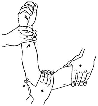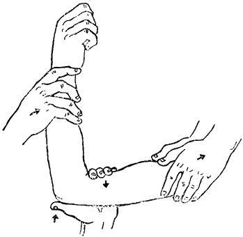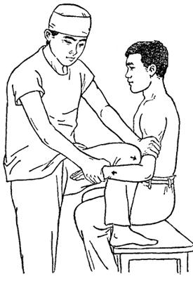 释义 | 肘关节脱位 肘关节脱位居全身关节脱位的首位,多因间接暴力所致,可分前脱位和后脱位两类。 一、肘关节后脱位:多发生在向侧方或后方跌仆时,手掌撑地,上肢外展或后伸,肘关节伸直或屈曲位时,向上冲击的暴力使尺骨鹰嘴向后上突破关节囊发生后脱位,常伴有喙突撕脱骨折。 二、前脱位:极为罕见。可发生在肘关节屈曲位,暴力由后上方向前下方冲击,常伴有鹰嘴骨折。 【症状及诊断】 有典型的致伤史,肘部疼痛、肿胀,伤肘呈135度左右的伸直位,功能丧失。鹰嘴向后上突出,肘后三角关系破坏。肘前方可扪及突出的肱骨下端,肘后可扪及突出的尺骨鹰嘴,应与肱骨髁上骨折鉴别。摄肘关节正侧位X线片可明确诊断。 【整复方法】 用针刺麻醉,或用0.5%普鲁卡因10~20毫升注入关节内作局部麻醉。 一、新鲜肘关节脱位: (一)肘关节后脱位复位法: 1.单人复位法:伤员坐于椅子上,术者立于伤侧,一腿屈膝足蹬在伤侧的椅子边角上(右侧用右膝,左侧用左膝),将伤肢屈曲肘窝抵在膝前,一手握住上臂下段,一手握住前臂下段,用力对抗牵拉,当听到或感到复位声响时,即已复位(图13~13)。 图13~13 肘关节脱位单人复位方法 2.双人复位法:伤员取坐位,助手握上臂下段,术者握腕部对抗持续牵引,2~3分钟后,术者一手继续维持牵引,另一手移向肘部,拇指抵住尺骨鹰嘴突用力向下向前推顶,其余四指托住肱骨下端向后搬拉,并逐渐屈曲肘关节,即可复位(图13~14)。 图13~14 肘关节脱位双人复位方法 3.三人复位法:适于脱位时间较长病例。体位同前。一助手握上臂下段,另一助手握腕部对抗持续牵引,待喙突被牵至滑车平面时,术者两手四指重迭用力向后拉肱骨下端,双手拇指向下向前推顶尺骨鹰嘴,同时,远侧助手屈曲肘关节,即可复位(图13~15) 图13~15 肘关节脱位三人复位方法 (二)肘关节前脱位复位法:伤员高度屈肘,助手握上臂下段,术者两手握前臂中上段对抗牵引,待尺骨鹰嘴被牵至滑车关节面时,术者一手继续牵引,另一手移向上方,拇指抵住尺、桡骨近端向下向后推,四指拉肱骨下端向前,即可复位。 二、陈旧性肘关节脱位: (一)松解粘连:患者仰卧位。在良好的麻醉下,一助手握上臂下段,另一助手握腕部及前臂,术者握肘部。在术者统一指挥下,牵拉、屈伸、摇动、旋转,以松解周围的瘢痕粘连。操作时,用力要由小逐渐加大,不可操之过急(一般需一小时左右),避免引起骨折。待松解至尺骨上端,可不费力地上下、左右移动3~5厘米,桡骨小头可牵至肱骨小头下缘和尺骨喙突牵至滑车平面时,方可开始复位。过伸牵引,两手四指置于肱骨下端前侧,拇指抵住鹰嘴,两助手在牵引下逐渐过伸肘关节,使鹰嘴紧贴肱骨下端以增宽滑车和半月切迹之间的距离。 (二)屈肘推按:远侧助手在持续牵引下逐渐屈曲肘关节,同时,术者四指用力向后拉肱骨下端,拇指用力向下、向前推按尺骨鹰嘴,此时多可听到有嘶嘶的响声,当听到滑动响声,说明已复位。因鹰嘴窝和喙突窝有较多的增生组织,影响稳定性。因此,复位后助手应继续维持位置,术者一手拇指抵住鹰嘴,四指固定肱骨下端,另一手握前臂,伸屈、辗转,将关节而增生组织尽行剥离,直到比较稳定为止。 【固定方法】 一、器材:直角铁丝托一个,三角巾一条,绷带。 二、方法:屈肘90度,前臂旋后位,肘后置铁丝托,绷带缠绕固定,用三角巾将伤肢悬吊于胸前。 三、固定时间:直角铁丝托固定一周,三角巾悬吊三周。 【注意事项】 一、复位后即日起,练习腕、肩及手部关节伸屈活动,去铁丝托固定后,开始练习肘关节伸屈,但活动范围不宜超过15度,两周后活动范围可达30度,三周后可达45度。功能锻炼期间,忌用强力被动活动,以防止产生骨化性肌炎。 二、复位时,不论用何种方法,凡合并有侧方移位者,均应先矫正侧方移位,再按复位手法整复。 三、并有肱骨内髁骨折或喙突骨折者,一般在脱位整复后骨折片亦即随之复位,如不能复位,可按骨折复位法予以整复。但铁丝托固定时间需延长,一般需要三周。 四、脱位时间超过三周者即为陈旧性脱位,手法复位虽较新鲜病例困难,只要手法运用得当,仍可获得成功,故对三个月以内的病例均可试用手法复位。对个别手法复位失败者,应切开复位。但对有骨质疏松的高龄病人,也可使其自然恢复。 【附】 肘关节脱位切开复位术 在肘后中线稍偏外侧作纵形皮肤切口,行倒“V”型切断肱三头肌腱(详见陈旧性肱骨髁上骨折鱼嘴手术),将尺骨近端完全游离,清除鹰嘴窝和喙突窝增生组织,切除肥厚的关节囊和一切疤痕组织,使肘关节周围的软组织松解,复位后牵拉前臂使鹰嘴和滑车之间保持1厘米的距离。屈肘90度,用直径1.5毫米钢针自鹰嘴后侧插入肱骨下端,针尾留于皮外0.5厘米,缝合切口。术后直角铁丝托固定屈肘90度,前臂旋后位,两周后拆线拔出钢针练习肘关节功能。 |