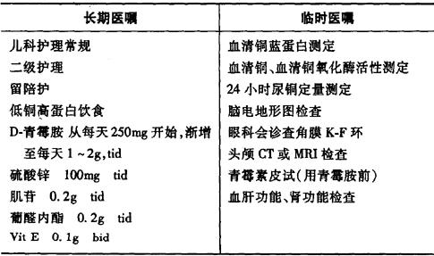 释义 | 肝豆状核变性 说明:1.饮食疗法,忌食肝、蘑菇、巧克力、贝壳类、坚果类食品。低铜食物有:牛奶、瘦肉、马铃薯、苹果、萝卜、精白米面、砂糖等。 2.不论肝功能是否正常均应保肝治疗。 3.硫酸锌不能与D-青霉胺同时服用,两者服用至少要相隔2小时。 4.青霉胺是目前治疗本病较好的药物,开始剂量偏小,以后逐渐加大,至症状基本缓解后减为维持量;需坚持持续使用,用药期间注意复查血常规,使用本药前必须作青霉素皮试,阴性者方可使用。如阳性可改用二巯基丙醇或二巯基丁二酸钠。 5.必要时进行肝移植。 |