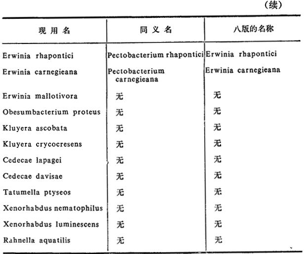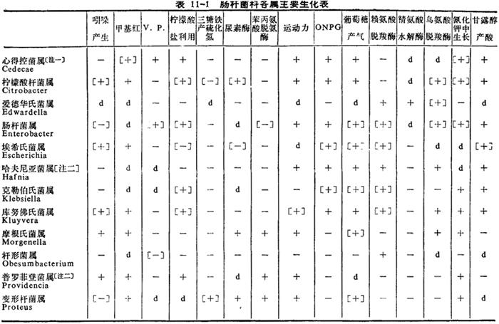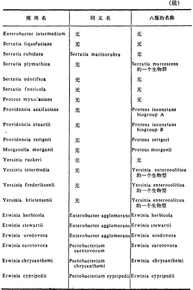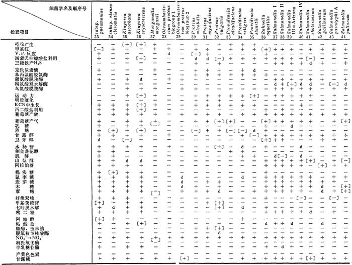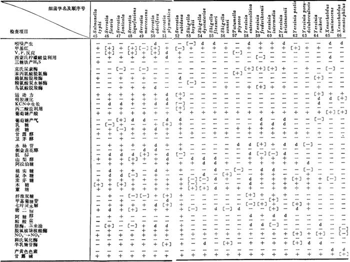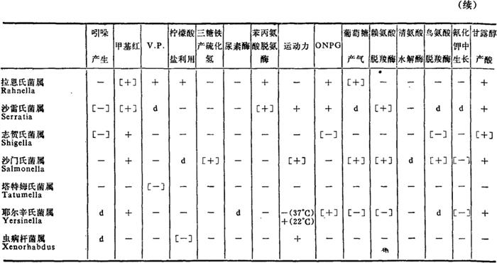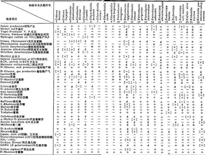 释义 | 肠杆菌科 肠杆菌科的特点为革兰氏阴性杆菌,中等大小(0.3~1.0μm×1.0~6.0μm),运动者周身鞭毛,无芽孢,无或有荚膜,非抗酸性,易生长(在含肉浸汤、蛋白胨的培养基中,25~37℃下,24h内可生长好),兼性厌氧,氧化酶阴性,接触酶多为阳性,必定发酵葡萄糖产酸或产酸又产气,绝大多数还原硝酸盐,均含有共同的肠杆菌科抗原,其DNA的G+Cmol%为38~60%。 这一科极为重要,不仅有许多人、畜、禽的重要病原菌,而且是食品卫生、环境保护中重点检查对象。分布广,常见。 本科细菌的分类与命名,不断地有些变化,根据1984年第一版《伯吉氏系统细菌学》卷一,除与植病密切相关的欧文氏菌属(Erwinia)外,还有19个属,它的区别,是以多项生化反应为依据,其主要项目见表11-1。 表11-1 肠杆菌科各属主要生化表 [注一]:Cedecae,从CDC三字来,为了便于读,中间加上两个母音e,成Cedec,再按拉丁化加上语尾,成Cedecae。CDC是美国位于乔治州的《疾病控制中心》(Centers for Disease Control)的缩写。此属菌最早在这个中心操作并命名。如译为“疾病控制中心菌属”则字体太长,故音译为“心得控菌属”。 [注二]:哈夫尼亚是丹麦首都哥本哈根的旧名;普罗菲登是美国罗德岛州的首府。 各反应均为37℃培养48h的结果,但明胶液化为22℃,虫病杆菌属及拉氏耶辛氏菌培养在25℃,脱氧核糖核酸酶的活力测定亦为25℃。 至于肠杆菌科中现列的66种细菌,其生化、运动力、产黄色色素的情况,见表11-3。 表11-3 肠杆菌科中66种细菌的生化鉴定 符号说明:见表11-1项下。 符号说明: ONPG是邻位硝基酚β-d-半乳糖甙(Ortho-Nitro-Phenyl β-d-Galactopanoside)的缩写。 +——90~100%的菌株是阳性。 [+]——76~89%的菌株是阳性。 d——26~75%的菌株是阳性。 [-]——11~25%的菌株是阳性。 -——0~10%的菌株是阳性。 V.P.是维(Voges)培(Proskauer)二氏反应,亦称乙基甲基原醇(Acetyl-methyl-carbinol)反应。 表中所列细菌学名,相应的中文名如下。 1.大氏心得控菌 2.拉氏心得控菌 3.阴丙二酸柠檬酸菌 4.异柠檬酸菌 5.佛氏柠檬酸菌 6.保科氏爱德华氏菌 7.鲇鱼爱德华氏菌 8.迟钝爱德华氏菌 9.迟钝爱德华氏菌生物Ⅰ型 10.产气肠杆菌 11.聚团肠杆菌 12.阴沟肠杆菌 13.基阁肠杆菌 14.中间肠杆菌 15.坂崎氏肠杆菌 16.不脱羧埃希氏菌 17.蟑螂埃希氏菌 18.大肠埃希氏菌 19.钝性大肠埃希氏菌 20.蜂房哈夫尼亚菌 21.产酸克勒伯氏菌 22.肺炎克勒伯氏菌鼻炎亚种 23.肺炎亚种 24.鼻硬结亚种 25.抗坏血酸阳性库努佛氏菌 26.冷生库努佛氏菌 27.摩氏摩根氏菌 28.变形杆形菌生物Ⅰ型 29.变形杆形菌生物Ⅱ型 30.奇异变形杆菌 31.粘变形杆菌 32.普通变形杆菌 33.产碱普罗菲登菌 34.雷氏普罗菲登菌 35.斯氏普罗菲登菌 36.居水拉恩氏菌 37.沙门氏菌第Ⅰ“亚属” 38.沙门氏菌第Ⅱ“亚属” 39.沙门氏菌第Ⅳ“亚属”,即亚利桑那菌 40.沙门氏菌第Ⅳ“亚属” 41.猪霍乱沙门氏菌 42.鸡沙门氏菌 43.甲型副伤寒沙门氏菌 44.雏白痢沙门氏菌 45.伤寒沙门氏菌 46.无花果沙雷氏菌 47.泉沙雷氏菌 48.液化沙雷氏菌 49.粘质沙雷氏菌 50.气味沙雷氏菌 51.普利茅斯沙雷氏菌 52.悬钩子沙雷氏菌 53.鲍氏志贺氏菌 54.痢疾志贺氏菌 55.弗氏志贺氏菌 56.索氏志贺氏菌 57.痰塔特姆氏菌 58.肠结肠耶辛氏菌 59.佛氏耶辛氏菌 60.中间耶辛氏菌 61.克氏耶辛氏菌 62.鼠疫耶辛氏菌 63.假结核耶辛氏菌 64.拉氏耶辛氏菌 65.发光病杆菌 66.嗜虫病杆菌 由于本科细菌的一些新名词的出现,特列表11-2以供参考。 表11-2 肠杆菌科某些细菌新老名词对照 ①现用名指1984年出版的伯吉氏系统细菌学(Bergey′s Systematic Bacteriology)第一版卷一上所用的名称。 ②八版的名称指1974年出版的(中译本系科学出版社1984年发行)伯吉氏细菌鉴定手册(Bergey′s Systematic Bacteriology)第八版的名称。 ③表中的“无”字,是指1980年Skerman等发表的“承认的细菌名称表”(“Approved Lists of Bacterial Names”)上无,不是指过去文献中无。因为过去文献中有形形色色的细菌名,而其中有的已弃而不用。“承认的细菌名称表”发表于国际系统细菌学杂志(International Journal of Systematic Bacteriology)30卷225~420页。 但同义名项下*号所指的细菌名,却是“承认的细菌名称表”上无,但此细菌名曾广泛地被用过,有过一定的使用面,故列。 本科19个属中只介绍7个属,其余的属,在兽医微生物实验诊断中少见或罕见或不会遇见。如遇到,首先定下是肠杆菌科后,再进行检定。 |