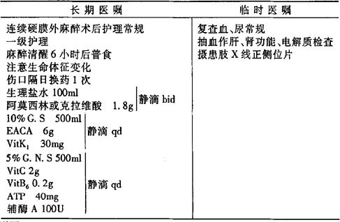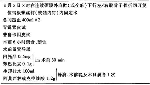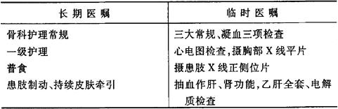 术前医嘱 手术医嘱 说明:(1)急症病人可暂不作肝、肾功能、乙肝全套、电解质检查。 (2)术前可使用止血、消炎药物及适当补液。 术后医嘱 说明:出院医嘱为,①继续全休6个月;②回当地继续进行康复治疗;③4周后逐渐进行患肢肌肉锻炼;④3个月后可扶双拐不负重行走;⑤定期门诊复查,每2~3个月摄X线片复查,直至骨折愈合。 |