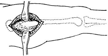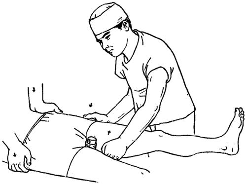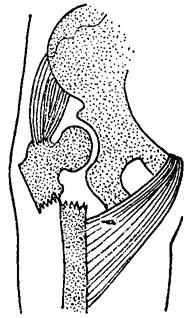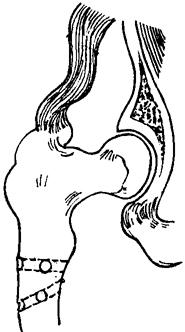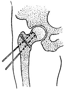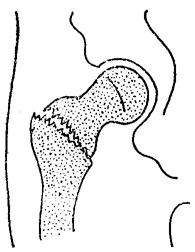 释义 | 股骨粗隆部骨折 粗隆间骨折多见于老年人,致伤原因与股骨颈骨折大致相同。根据骨折移位情况可分: 一、外旋型骨折:骨折线自大粗隆顶点的外侧,斜向内下方,止于小粗隆的内上缘或稍下方(图11~10)。 图11~10 外旋型股骨粗隆间骨折 二、内翻型骨折:骨折线自大粗隆内下方斜向外上方,止于大粗隆上方。小粗隆及大粗隆内侧常有粉碎骨片,髋内翻畸型严重(图11~11)。 图11~11 内翻型股骨粗隆间骨折 三、内旋型骨折:骨折线由小粗隆与股骨颈基底之间,斜向外下,止于股骨干的外侧,呈斜形或短螺旋形骨折。骨折近段外展、外旋,远折段向内、向上移位(图11~12)。 图11~12 内旋型股骨粗隆间骨折 四、粗隆下骨折:骨折线在小粗隆下方,多为横形或锯齿形(图11~13)。 图11~13 粗隆下骨折 【症状及诊断】 伤后髋部疼痛,大腿上部明显肿胀,不能站立,局部压痛,常可扪及骨异常活动,下肢短缩呈外旋畸型,活动髋关节及叩击足跟部,可引起伤部剧烈疼痛。拍X线片可明确诊断。 【整复方法】 一、皮牵引复位法:适用于移位不大的年迈病人。将伤肢伸直外展30度,足尖向上进行牵引,髋内侧放置沙袋,防止内收。牵引重量3.5~5公斤,争取在一周内完成复位。牵引时间一般需4~6周。 二、胫骨结节牵引复位法:适用于移位较多,骨折不稳定,年龄在60岁以内,身体健康状况尚好者。牵引时,置伤肢外展25~35度,足尖向上,屈髋20度,屈膝20度。牵引重量可根据肌力强弱和体重大小而定。开始重量一般为6~8公斤,牵引3~4日后,床边摄髋关节正侧位X线片,观察复位情况,要求在一周内复位。复位后改维持量,一般为4~5公斤。如有前后和侧向移位,可用推挤端提手法矫正。 三、快速牵引复位法:适用于移位明显,骨折不稳定的壮年伤员。复位时,伤员仰卧于牵引床上(同股骨颈三刃钉内固定手术床),针刺麻醉下,一助手用两手分别按压双侧髂前上棘,固定骨盆。另一助手握伤肢踝部和小腿中下段,先顺伤后位牵引,再逐渐外展内旋。术者立于伤侧,用一手掌基部抵住大粗隆顶部,向内推压,用另一手置于大腿中段内侧,随着助手的牵引,用力将伤肢内旋外展(图11~14),然后将足部固定在股骨颈骨折牵引复位器上,保持伤肢外展30度,内旋20度位。摄髋关节正侧位X线片,如仍残留有重迭移位,可调节足架上的调轮矫正之,如有前后移位,用提按手法矫正,内外移位,用推拉手法矫正。 图11~14 粗隆部骨折快速复位手法 【固定方法】 一、外展板固定: (一)器材:外展板1个,纱布衬垫、绷带等。 (二)方法:无移位粗隆间骨折,用外展夹板固定伤肢于外展20~30度,足中立位。用皮牵引复位者,经牵引5~7日后,骨折移位基本矫正,肿胀消退后,再用外展板固定。 (三)固定时间:4~6周。 二、骨牵引、小夹板、外展板固定:对移位明显的粗隆间骨折,在骨牵引复位后,用股骨小夹板加外展板固定。 (一)器材:股骨小夹板4块,外展板1块,大平垫2个,束带、纱布衬垫等。 (二)方法:骨牵引手法复位后,用纱布衬垫包敷大腿。在大粗隆外侧、股上段内侧,各放一大平垫,胶布固定。再将四块小夹板放妥捆扎固定,先扎下方三条,上端的一条先在外侧板的上端打结缚牢,再环绕捆扎,最后置外展板固定于伤肢外展30度位(图11~15)。 图11~15 粗隆间骨折小夹板加外展板固定方法 (三)固定时间:骨牵引3~4周,继续外展板固定4周。 三、闭合插钢针内固定:适用于移位严重,复位后极不稳定的外旋型与内翻型青壮年伤员。 (一)器材:直径3.5毫米骨圆针2~3支。 (二)方法:复位后助手立于健侧,一手置于大粗隆上端向内侧拉,一手置于股部上端内侧向外推,利用两点挤压固定,术者由大粗隆下缘2厘米和4厘米各斜向内上,沿股骨颈纵轴插入骨圆针2支,深度达股骨头中央部(图11~16)。如仍不甚稳定,可于两骨圆针连线中点的前方1厘米处,再插一骨圆针,最后将针尾埋于皮内,无菌敷料包扎,术后外展板固定。 图11~16 粗隆间骨折闭合插钢针固定方法 (三)固定时间:8周。 四、固定牵引器小夹板固定: (一)器材:轻便牵引固定器1套,直径3.5毫米骨圆针1支,股骨小夹板4块,束带、纱布衬垫等。 (二)方法:先于股骨髁上打入一枚骨圆针,然后再用快速牵引手法复位夹板固定,安装固定撑开器,调节扩张杆,维持复位后的位置,使内侧支撑力大于外侧,以保持伤肢外展20~30度(详见第八章持续牵引技术)。 (三)固定时间:6~7周。 【注意事项】 一、股骨粗隆间骨折一般多系高龄伤员,长期卧床,易导致心肺并发症,应鼓励病人早期活动,伤后5~7日可带牵引坐起活动。 二、股骨粗隆部血运丰富,无骨不愈合之忧,一般不需切开复位内固定,即使开放性骨折,也应以清创缝合后,用牵引加夹板外固定为好。 三、股骨粗隆间骨折,固定期间需注意保持伤肢外展位,防止髋内翻。 四、陈旧性粗隆间骨折,如病人为青壮年,内翻畸形严重者,可行股骨粗隆下外展截骨。 【附】 股骨粗隆下外展截骨术 伤员取仰卧位,患侧臀部及大腿稍垫高(与床面呈10~15度角),在针麻或硬膜外麻醉下,以大粗隆为中心,作长12厘米之切口,充分显露大、小粗隆及以下4厘米的股骨干(图11~17)。用骨刀在相当于平小粗隆的下缘处作一骨印,然后根据术前计算的截骨角度,作一楔形截骨之骨印,先在其外侧和前侧的上下缘各向对侧钻孔(图11~18).防止切骨时劈裂。钻妥后,用锐利骨凿,将楔形骨块切除(勿切断内侧骨皮质)。此时,术者一手抵紧大粗隆,另一手外展伤肢使两断面紧