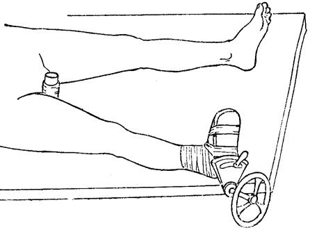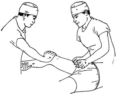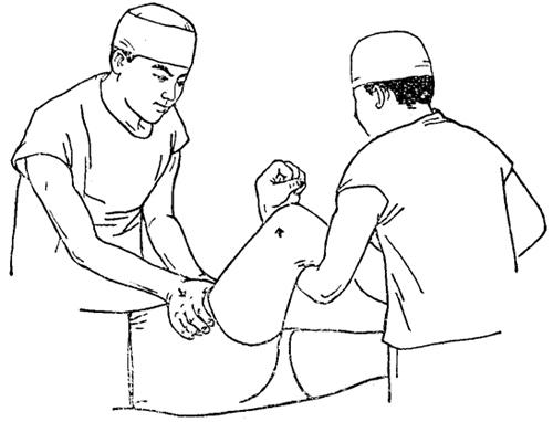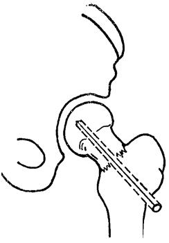 释义 | 股骨颈骨折 股骨颈骨折多因滑跌时臀部着地的间接暴力所致。根据暴力作用方向和骨折移位情况可分为两型。 一、外展型:多因外展伤力所致,骨折面倾斜度小,骨折线和股骨纵轴线垂线的交角在30度以内,骨折多发生在股骨颈基底部,骨片无移位或有嵌入,比较稳定,多见于儿童和青少年伤员,预后较好。 二、内收型:多因内收暴力所致,骨折面倾斜度大,骨折线和股骨纵轴线垂线的交角在31度以上。骨折多发生在头下或颈部,远折段向上移位,颈干角小。根据骨折线发生的部位不同,又可分为三型: (一)头下型:骨折线发生在股骨头下1厘米以内者。此型最多见,易发生骨折不愈合和股骨头无菌性坏死。 (二)经颈型:骨折线发生在股骨头下1厘米和股骨粗隆间线内1厘米之间,骨折线多呈斜形,由外上斜向内下。 (三)基底部:骨折线发生在髋关节关节囊外,属囊外骨折,预后较好。 【症状及诊断】 有跌伤病史,伤肢缩短,功能障碍,呈典型的髋关节轻度屈曲、内收及外旋畸型。鼠溪部较饱满有压痛,活动髋关节时可引起剧痛,叩击足跟及大粗隆,有明显的传导痛。拍髋关节正、侧位X线片,可明确骨折部位、类型和移位情况。 【整复方法】 伤员仰卧于特制的股骨颈骨折三刃钉内固定手术床上(图11~1),床的尾部装有特制的牵引复位器(图11~2)。用立柱挡住伤员的会阴部,将伤肢足部固定在牵引复位器的足托上(图11~3)。伤肢外展30度,然后旋动调轮进行牵引,待牵引至与健肢等长或稍长时,将髋内旋15度即可。此时,术者一手按压腹股沟即相当股骨颈的部位,另一手置于大粗隆外后部向前提拉,并同时向内推挤,以纠正向前成角和进一步使骨折断端紧密嵌插。 图11~1 股骨颈骨折三刃钉内固定手术床 1.立柱 2.半月形缺口 3.三角形活动板 4.床尾横形移动板 图11~2 牵引复位器 图11~3 转动调轮牵引复位 如用上法复位不良或者复位后插导针时发生股骨头旋转者,可改变手法另行复位。伤员体位同上,由一助手按压双侧髂前上棘,固定骨盆。术者一手握伤肢踝部,另一前臂套住伤肢腘部,屈髋膝90度,向前牵拉,使向上移位的远段被牵下(图11~4)。当股骨头在外展位时,向前牵拉的同时,应适当外展;当股骨头在内收位时,牵拉方向宜适当内收。一般牵引2~3分钟后,远断段即可被拉下,然后逐渐伸髋伸膝同时内旋、外展(图11~5),将伤肢固定在外展30度内旋15度位。 图11~4 屈髋屈膝向前牵引方法 图11~5 伸髋、膝同时内旋外展伤肢 【固定方法】 一、三刃钉内固定: (一)器材:三刃钉、导针、三刃钉打拔器、无菌术用品。 (二)方法: 1.复位后放置定标器,摄第一次X线照片。定标器系长约30厘米、直径2毫米的钢丝制成,呈“L”形。将其短臂放置在大粗隆下方2.5厘米处,长臂恰置腹股沟韧带与股动脉搏动外下各0.5厘米处。放好后,用胶布固定。摄髋关节正侧位X线片。 根据X线片,了解复位情况和导针进入的方位线。如果满意,可用龙胆紫沿定标器划出打入导针方向线的标记。 2.闭合插导针:皮肤常规消毒后,摸清股骨大粗隆,于其下2.5厘米处,刺入导针直达骨膜,用前后滑动方法,确定骨干的中央部,然后用骨钻沿定位线方向钻入导针,或用骨锤打入亦可。插入导针的方向朝向股骨头中心,并保持导针与手术台平面平行,使其沿股骨颈纵轴线正确进入。第一支打入后,再以同样方法按稍不同方向打入2~3支,以供选择较好位置的导针。用无菌巾盖好手术野,摄第二次正、侧位X线片。 3.小切口打入三刃钉:根据X线片,选择较好导针,以此导针为中心,作3厘米长之纵切口,切开皮肤直达骨膜下部,并充分显露导针基部,测量导针深度,选择合适长度的三刃钉,并进一步将导针打入髋臼作固定,以防股骨头旋转。然后用峨嵋凿在导针上下将股骨外侧凿成骨印,以防骨质劈裂。把选好的三刃钉安装在打入器上,左手固定,右手持锤徐徐打入,直至针尾留在骨皮质外0.5厘米为止,然后拔出导针,用嵌插器嵌插。以无菌巾盖好手术野,拍第三次正位X线片,了解三刃钉的位置和方向是否合乎要求。要求三刃钉尖端离股骨头关节面0.5厘米,方向与内倾角一致或稍大,骨折端接触紧密,头无旋转(图11~6)。满意后,缝合切口。术后穿中立不倒鞋(图11~7)。 图11~6 良好三刃钉的位置 图11~7 不倒鞋 (三)固定时间:固定伤肢中立位3~4周。1~1.5年拔出三刃钉。 二、骨圆针固定:用于16岁以下的伤员、成人基底部骨折或外展形骨折。 (一)器械:直径3毫米不锈钢针3支,外展板1块、绷带等。 (二)方法:按体表定位方向(见三刃钉固定方法),沿股骨颈纵轴线,平行将三支钢针打入。针的深度以尖部距股骨头关节面1厘米为限,最后将针尾弯曲埋于皮下。术后用外展板保持足中立位,伤肢外展15度。 (三)固定时间:骨折愈合后(一般需3~4月),拔出钢针。 三、外展板固定:适用于外展型骨折。 (一)器材:单关节外展板(详见第三章)1块、棉垫3个、绷带等。 (二)方法:稍经牵引复位后,肢体外展20度,于胸腋部、髋外侧、膝外侧各放棉垫1块,将外展板置于伤侧,上达腋下,下达胫骨外髁,分别用5条宽布带与躯干和伤肢捆扎固定。 (三)固定时间:6~8周。 【注意事项】 一、三刃钉或骨圆针固定术后一周,可坐起及屈伸髋关节,但要作到三不(不盘腿、不侧卧、不下地)。三周后,可扶双拐下床,伤肢不负重活动。骨圆针固定后每两个月,三刃钉固定每三个月,拍X线片一次。如已愈合坚固,无股骨头坏死现象,即可负重