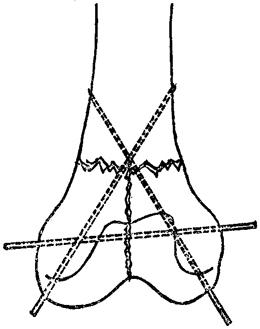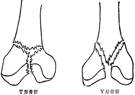 释义 | 股骨髁骨折 股骨髁骨折,多因压缩性间接暴力所引起,如从高处坠落,足跖部着地等。骨折线常呈“T”形或“Y”形(图11~25)。 图11~25 股骨髁骨折 【症状及诊断】 伤后膝部疼痛,高度肿胀,功能障碍,关节内大量积血,内、外髁部压痛,并有骨擦音。摄膝关节正侧位X线片,可明确诊断和类型。 【整复方法】 一、“T”或“Y”形骨折:在股神经、坐骨神经麻醉下,先抽出关节内积血,然后一助手双手把持大腿中、上段,另一助手把持小腿近端对抗牵引,术者立于患侧,两手掌分别置于内、外髁部,随着助手的牵引,两手分别向中线、向上推动挤压。待听到骨响或摩擦感,即说明骨片复位。 二、股骨单髁骨折:外髁骨折,膝关节稍内翻屈曲90度;内髁骨折,膝稍外翻屈曲145度。助手一手托住小腿上端后侧,另一手握踝部。术者立于患侧,一手拇指和食、中、无名指摸清并捏住骨片,向移位相反的方向推顶,另一手于对侧,形成对向挤压的力量,迫使骨片复位。 【固定方法】 一、超膝夹板固定:适用于骨折移位不多,关节面平整,比较稳定的病例。 (一)器材:超膝关节夹板4块,梯形垫2个,纱布、衬垫、束带等。 (二)方法:纱布衬垫包敷局部,于内外髁部各放一梯形垫,胶布固定。置前、后、内、外四块夹板,六条布带捆扎固定。 (三)固定时间:4~6周。 二、闭合插钢针内固定: (一)器材:直径2毫米钢针3支,超膝固定板4块,梯形垫2个,布带、纱布等。 (二)方法:骨折复位后,助手按压移位的髁部。术者在无菌操作下,分别由股骨内髁的下缘和股骨外髁的外下缘,向上呈45度角,各插一支钢针,将移位的骨块固定于骨折近段。如髁间有分离,可再由外髁向内侧横插一钢针,将两髁贯穿固定(图11~26),针尖要穿过对侧骨皮质0.3厘米,将针尾剪断,弯曲埋于皮下。如为单纯股骨内髁或外髁骨折,可插一支钢针固定,方法同前。无菌敷料包扎,超膝夹板固定。 图11~26 股骨髁T形骨折闭合插钢针固定 (三)固定时间:临床愈合后拔出钢针,一般需8~12周。 【注意事项】 一、股骨髁骨折,系关节内骨折,整复时要求关节面平整,固定时要求牢固可靠。单纯超膝夹板固定,常可引起再移位,故除移位较轻的稳定骨折外,均以采用闭合插钢针内固定为佳。 二、股骨髁骨折,有可能损伤腘窝部血管、神经,整复前和整复后一周内,应密切观察,注意足部皮肤颜色,足背动脉搏动和足趾运动情况,不可粗心大意。 三、必须早期活动,整复后即可开始练习踝关节伸屈和股四头肌收缩活动。一周后逐渐练习膝关节伸屈,三周后膝关节屈伸范围应达到50度。外固定解除后,即可持拐负重行走。 四、闭合复位不能达到良好对位者,应尽早切开复位内固定。 【附】 股骨髁骨折切开复位内固定术 一、股骨双髁骨折:取膝关节前内侧切口(图11~27)。自髌上6厘米,向下绕过髌骨内缘,达胫骨结节下缘,逐层切开皮肤、皮下脂肪和深筋膜,于股直肌和股内侧肌之间隙进入,骨膜下显露股骨下端和内、外髁骨块,消除断端间积血和增生组织,用布巾钳持骨块复位,先用一支2毫米的骨圆针横行贯穿固定内、外髁骨块,然后再由内髁的内下缘斜向外上方和由外髁骨块的外下缘斜向内上方,各插一支直径2毫米的骨圆针,交叉固定,剪短针尾,埋于皮下,缝合切口。 图11~27 膝关节前内侧切口 二、股骨内髁骨折或外髁骨:以骨折块为中心作切口,显露移位的骨块后,清除断端间积血和增生组织,用布巾钳的牵拉和胫骨平台的推顶作用,使骨块复位。用一长螺丝钉固定或两支骨圆针交叉固定,剪短针尾,埋于皮下,缝合切口。术后石膏托固定膝关节170度位,拆线后换超膝夹板固定。 |