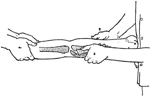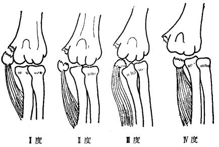 释义 | 肱骨内上髁骨折 肱骨内上髁骨折多因肘外翻伤力和前臂屈肌剧烈收缩所致。根据移位程度可分为四度。 Ⅰ度:骨折断片轻度分离。 Ⅱ度:骨折断片被牵拉至肱尺关节平面。 Ⅲ度:骨折块嵌于尺骨鹰嘴和滑车之间。 Ⅳ度:伴有肘关节外侧脱位(图10~38)。 图10~38 肱骨内上髁骨折分型 【症状与诊断】 肘部内侧肿胀,皮下瘀血斑、压痛,Ⅰ、Ⅱ度骨折多能扪到骨片有异常活动。如为Ⅲ度、Ⅳ度骨折,则肘部呈外翻畸形,功能丧失,摸诊肘内侧平坦。摄X线片可明确骨折移位情况。 【整复手法】 Ⅰ、Ⅱ度骨折,无需麻醉,伤员取仰卧位,一助手固定上臂,术者一手握伤肢前臂中、下段,屈肘135度,另一手拇指指腹在内上髁周围轻轻按摩以驱散瘀肿,摸清骨片用力向外上方按压,同时将前臂旋前,并逐渐屈肘至90度即可复位。 Ⅲ度骨折,在良好麻醉下,一助手把持上臂中段,术者一手把持前臂旋后位牵引2~3分钟后,用上腹部抵住伤肢手掌,使腕指过伸,并用力外展前臂,以增宽肘内侧关节间隙。同时,另一拇指和食、中、无名指抓住尺侧屈腕肌上段肌肤,用力向尺侧、向下牵拉,即可将吸入关节腔的内上髁骨片提出(图10~39)。如此法失败,可用一手提拉尺桡骨上端向尺侧,一手推肱骨下端向桡侧,逐渐屈肘至90度,将骨折片挤出关节腔。然后按Ⅱ度骨折处理。 图10~39 肱骨内上髁骨折复位手法 如为Ⅳ度骨折,可先整复肘脱位,使其转化为Ⅰ、Ⅱ度骨折,然后按上法复位。如骨片仍夹在肱尺关节内,再按Ⅲ度骨折处理。 【固定方法】 一、夹板固定: (一)器材:叉形板1块,超肘平板3块,塔形垫1个,双峰垫1个,直角铁丝托1个,束带、纱布衬垫、绷带等。 (二)方法:Ⅰ度骨折屈肘90度前臂旋前位,用直角铁丝托固定。 Ⅱ~Ⅳ度骨折,局部用四层纱布衬垫环包肘部,内上髁部放少量棉花,外上髁上方放塔形垫,内髁部放双峰垫(图10~40),用胶布固定。先放内外侧板,后放前后侧板。三条布带固定肘上,一条布带封肘。肘后放铁丝托肘屈90度,前臂旋前位固定。 图10~40 肱骨内上髁骨折双峰垫夹板固定 (三)固定时间:三周。 二、闭合插钢针内固定:适用于局部肿胀严重及骨折在小夹板固定中反复再移位者。 (一)器材:1.5毫米直径骨圆针1支,直角铁丝托1个。 (二)方法:患者仰卧,肩外展60度,前臂旋前,屈肘90度,无菌操作下,术者一手固定骨片,另一手持钢针由骨折块下部按与上臂呈60度方向刺入,经骨折块斜行贯穿固定于肱骨上,针尾留于皮外0.5厘米(图10~41),无菌纱布包扎。术后用直角铁丝托置于肘后,前臂旋前屈肘90度位固定。 图10~41 肱骨内上髁骨折闭合插钢针固定 (三)固定时间:术后两周去掉铁丝托,3~4周拔出钢针。 【注意事项】 一、整复后即作肩关节及手指功能锻炼,一周后进行腕关节屈伸活动,但禁作前臂旋转活动。两周后作肘关节活动。解除固定后,继续功能锻炼,有的病例功能恢复较慢,伤后两个月肘关节伸屈尚不能完全恢复正常,此时忌用大力被动按摩,应坚持继续自动锻炼,最终仍能恢复。 二、Ⅳ度骨折整复后易出现肘关节向外侧再脱位,故应在整复后第一周内注意观察,如有脱位,应及时矫正。 三、Ⅰ度与Ⅱ度骨折如经闭合处理未达到解剖复位,一般不需切开复位,因为愈合后不影响关节功能。但合并有尺神经损伤症状者,需手术探查,同时将骨片复位或切除。 四、个别病例在愈合过程中,可因骨痂压迫而继发尺神经损伤,故应注意观察,有否神经损伤症状。 五、对骨片进入关节腔或翻转移位90度以上,手法复位失败者,可切开复位。如系陈旧性骨折,可行骨片切除。 【附】 肱骨内上髁骨折手术切开复位 以骨折块为中心,行肘关节内侧切口,切开深筋膜后,先显露尺神经,向下游离达前臂尺侧屈腕肌分支,向上游离3厘米,用橡皮膜牵开保护之。于肱三头肌和肱二头肌之间隙进入,清除血肿或增生组织,充分显露骨折两断面及远端骨片上前臂屈肌群的附着部,然后屈肘145度,将前臂旋前,肘关节内翻,用布巾钳夹持骨片,准确复位,用两支钢针交叉固定,针尾留于皮下。为避免以后发生尺神经损伤,应同时行尺神经前置术,术后用铁丝托固定两周,骨愈合后拔出钢针(一般需4~6周)。 |