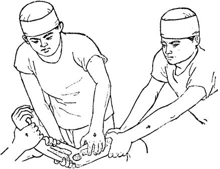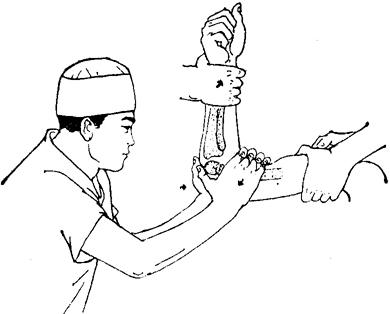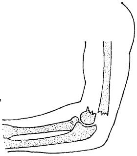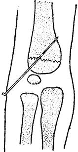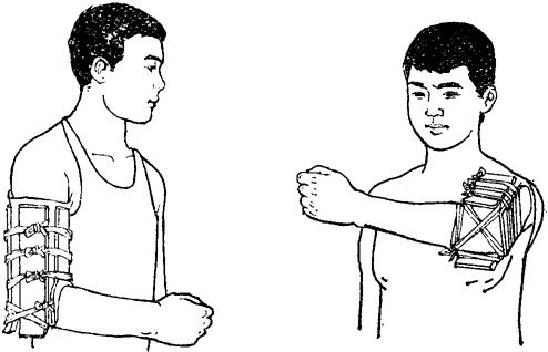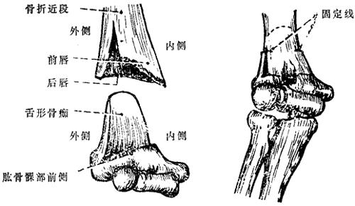 释义 | 肱骨髁上骨折 肱骨髁上骨折临床较常见,约占全身骨折的6.22%。根据骨折移位情况可分为四型。 一、伸直型:临床多见,占90%。骨折线由前下斜向后上方,远断段向后向上移位(图10~18)。 图10~18 肱骨髁上骨折(伸直型) 二、屈曲型:骨折线由后下方,斜向前上方,远段向前移位(图10~19)。 图10~19 肱骨髁上骨折(屈曲型) 三、粉碎型:多见于成人,常由直接暴力造成。 四、幼儿低位型:多见于5岁以内的小儿,骨折线在肱骨滑车的上缘,肘内翻发生率甚高。 以上四型,又可根据侧向移位方向的不同而分为尺偏型和桡偏型。 尺偏型:骨折远段被推向内侧,其外侧骨皮质断裂,内侧骨皮质塌陷,骨膜被掀起(图10~20),复位后不稳定,容易再向尺侧移位或倾斜,肘内翻发生率最高。 图10~20 肱骨髁上骨折(尺偏型) 桡偏型:骨折远段被推向外侧(图10~21)。此型骨折即使不完全复位,也不易发生肘外翻,如果矫正过度,则易并发肘内翻。 图10~21 肱骨髁上骨折(桡偏型) 【症状及诊断】 肘部疼痛肿胀,广泛皮下瘀血,有明显压痛,上臂缩短,肘关节曲伸功能丧失,可触有骨擦音。伸直型肘部向后突出,肘关节呈半屈位,应注意与肘脱位鉴别。 肱骨髁上骨折与肘关节后脱位鉴别表 【整复方法】 一、伸直型:伤员仰卧,在适当麻醉下,一助手两手握持伤肢上臂,另一助手握伤肢前臂,使肘关节略屈,前臂旋后位(肱骨髁上骨折多有旋前畸形),对抗持续牵引,待重迭移位和旋转移位矫正后,术者一手握骨折近段,一手握骨折远段,用推拉法矫正侧向移位(图10~22),再将两手四指置于肘窝前方扣住骨折近段向后拉,两手拇指顶住鹰嘴部,用力向前推顶。同时,令远端助手将肘屈曲70度,即可复位(图10~23)。尺偏型骨折复位后,术者一手固定骨折部,另一手握前臂肘关节略伸直,并将前臂向桡侧展伸,使骨折端桡侧骨皮质嵌插或稍桡偏,以防止发生内翻。 图10~22 肱骨髁上骨折复位手法(推拉法矫正侧向移位) 图10~23 肱骨髁上骨折复位手法(矫正前后移位) 二、屈曲型:矫正重迭移位时,肘关节应在屈曲位(120~90度)牵引;矫正侧向移位时,手法同伸直型;矫正向前移位,术者可用两手拇指由前方抵住骨折远段向后推顶,两手四指由后侧托住骨折近段向前提拉,即可矫正。 三、粉碎型:在助手徐徐牵引矫正重迭移位后,术者用两手掌抱住内外髁部,用力对扣捏合,即可使分离的骨片合拢。然后,术者一手握住骨折近段向后按压,一手由后侧握住粉碎的远段向前推送,即可复位。 【固定方法】 一、小夹板固定: (一)器材:肱骨髁上夹板4块(直板3块,叉形板1块),直角铁丝托1个,梯形垫1个,平垫两个,布带、绷带等。 (二)方法:助手维持伤肢位置,术者用四层绷带松松包绕上臂及肘部。根据骨折类型放好纸压垫,伸直尺偏型骨折远断段的后侧,放梯形垫,内侧放平垫,近断段的外侧放平垫。屈曲型,骨折近段后侧放平垫,近段外侧和远段内侧各放一平垫。各压垫放妥后,用胶布固定。三块平板分别放在内、外、后侧,叉形板放于前方,先捆上臂两条束带,最后一条将叉形板两角连同外、后、内三板,交叉连结扎紧,超肘关节固定(图10~24),最后用铁丝托托住前臂悬挂于胸前。伸直型前臂旋后位屈肘90度;屈曲型前臂旋后位曲肘145度;低位髁上骨折屈肘110~130度,肘外翻位固定两周后,改为屈肘90度位。 图10~24 肱骨髁上骨折小夹板固定方法 (三)固定时间:儿童2周,成人3周。 二、闭合插钢针固定:适用于因肿胀严重,复位后不能用小夹板固定或复位后不稳定者。 (一)器材:直径2.5毫米克氏钢针1支,直角型铁丝托1个,纱布、绷带等。 (二)方法:复位后,在无菌操作下由肱骨外髁斜向内上方插入钢针,使钢针斜行穿过两骨折段贯穿固定(图10~25),弯曲针尾,留于皮外,无菌敷料包扎。最后,置前臂旋后位屈肘90度,用直角铁丝托将前臂悬挂胸前。 图10~25 肱骨髁上骨折闭合插钢针固定方法 (三)固定时间:铁丝托固定两周,四周后拔出钢针内固定。 【注意事项】 一、开放性骨折就诊时间晚,局部高度肿胀,水泡形成,不能手法整复,或粉碎性骨片分离较大者,可用尺骨鹰嘴牵引,重量2.5~3.5公斤,通过调整牵引方向和重量使骨折复位。时间要求一般应争取2周内复位,最多不超过三周。待肿胀消退后,即改为夹板外固定。 二、整复后应检查桡动脉搏动情况,密切观察伤肢血运及知觉,每日调整布带松紧一次,防止束带过紧影响血循环,最初一周内最好每两天透视一次,发现移位应及时纠正。 三、伸直型者,一周内可作肩关节、腕关节和手指各种功能活动,一周后可做屈肘活动,两周后作伸肘活动。屈曲型者,一周后作伸肘活动,两周后作屈肘活动。 四、肱动脉和正中神经损伤是肱骨髁上骨折的严重并发症,在治疗的全过程中,必须想到并密切观察肢端血供情况。凡有血管损伤者,不宜夹板外固定。如伤肢手臂发冷、发绀或苍白、疼痛、麻痹,桡动脉触不到,可采用早期复位和应用血管扩张药物,继续密切观察有无其他缺血症状。如不见好转,则应立即手术探查。如单纯合并神经损伤,大多系挫伤所致,断裂者很少,无需急于手术探查,可经药物治疗观察1~2个月,如仍不恢复,可考虑手术探查。 五、对尺偏型,复位时要求矫枉过正,使其有轻度桡偏,复位后将肘外翻,使桡侧骨皮质嵌插,幼儿低位髁上骨折,整复中要使其桡侧偏和轻度外翻。对桡偏型,不要矫枉过正。如整复后一周发现骨折远段仍有向尺侧倾斜时,可改为肘关节伸