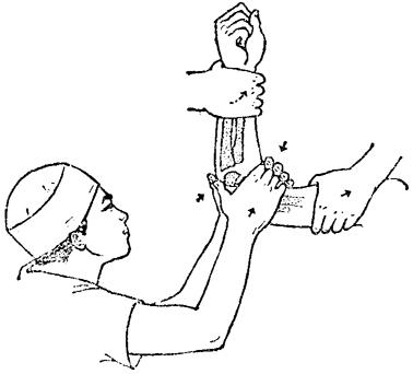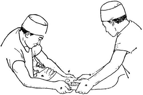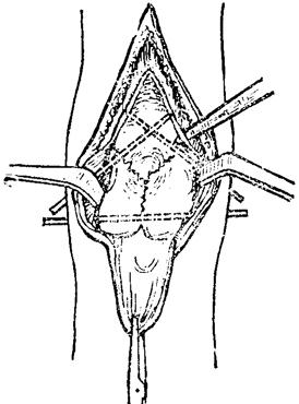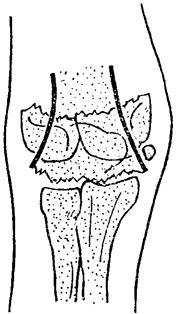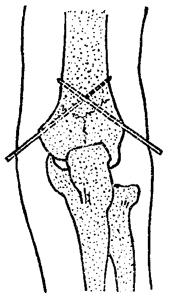 释义 | 肱骨髁间骨折 肱骨髁间骨折属关节内骨折,约占全身骨折的0.47%,多发生于成年人,根据致伤暴力和骨折移位情况可分为: 一、伸直型:跌仆时肘关节在伸直位,手掌着地向上的间接暴力,先造成肱骨髁上骨折,同时由上而下的重力使肱骨近折端将内外两髁劈开,然后向前移位(图10~27)。 图10~27 伸直型肱骨髁间骨折 二、屈曲型:跌倒时屈肘着地,暴力经过尺骨鹰嘴半月切迹,将肱骨两髁纵形劈裂,并推向前方,骨折近端向后移位(图10~28)。由于骨折线多呈“T”形或“Y”形,故又称“T”形骨折或“Y”形骨折。 图10~28 屈曲型肱骨髁间骨折 【症状及诊断】 肘部严重疼痛,高度肿胀,触压肘部可有骨擦音,注意和肘关节脱位鉴别。须注意检查桡动脉搏动情况、腕及手指温度、色泽、感觉和运动,确定有否血管或神经损伤,摄肘部正、侧位X线片,明确诊断和骨折类型。 【整复方法】 在针麻或血肿内麻醉下,伤员仰卧,肩外展70~80度前臂中立位屈肘110~135度。 一、抱髁、牵引:一助手双手握上臂中上段,一助手握持前臂,徐徐拔伸牵引,术者两手掌分别置于肘两侧面抱髁对扣挤合,经3~5分钟后,重迭和两髁分离移位即可矫正(图10~29)。 图10~29 肱骨髁间骨折复位手法(抱髁牵引) 二、抱髁推挤矫正侧方移位:以右侧为例,远折段如向尺侧移位,抱外髁之左手掌根部向上移至髁上,使腕部掌侧面紧贴外髁处皮肤,以代替大鱼际的抱髁作用。抱内髁之右手在对合压力下,将两髁向外侧推挤,此时常有骨擦音。侧向移位矫正后,左手紧贴皮肤,在稍加压力下回到外髁,恢复抱髁。 三、抱髁推顶矫正前后移位,以伸直型为例,术者两手在继续抱髁下,两手四指上移环抱肘前,两拇指移到尺骨鹰嘴处,向前推骨折远段,两手四指向后拉骨折近段,同时两手“虎口”对向挤压两髁,持前臂牵引的助手徐徐屈肘至90度(图10~30)。 图10~30 肱骨髁间骨折复位手法(抱髁推顶) 四、对扣捏合,部分病人骨折远段两髁因受两侧关节囊韧带的牵拉而向内、外旋转分离,使滑车关节面不平,此时,术者可一手抱髁,另一手拇指和四指在两髁处对向叩压,进一步矫正两髁的分离和旋转。 【固定方法】 一、小夹板固定法: (一)器材:叉形板1块,超肘夹板3块,梯形垫1个,塔形垫2个,直角铁丝托1个,绷带、束带、纱布、衬垫等。 (二)方法:维持牵引下屈肘90度前臂中立位,纱布衬垫包绕肘部,将梯形垫置于髁部后侧,两个塔形垫分别置于内、外髁部,用胶布固定。叉形板置前侧,超肘板分别置于内、外、后侧,先捆上臂两条布带,再将叉形板一角之布带连同超关节板交叉环绕,最后系在叉形板另一角固定。直角铁丝托短臂置于肘后,长臂托住前臂于旋后位固定。 (三)固定时间:4~6周。 二、闭合插钢针固定法:适应于夹板固定不稳定或因肿胀严重等原因,不宜夹板外固定者。 (一)器材:不锈钢针两枚,直角铁丝托1个,纱布、绷带等。 (二)方法:复位后,常规皮肤消毒,抱髁固定防止移位。术者分别于内外髁最高点下1厘米,按与上臂呈45度方向刺入不锈钢针,贯穿固定于肱骨干内、外侧皮质上(图10~31)。针尾埋入皮下,无菌敷料包扎,直角铁丝托固定于前臂旋后位,屈 肘90度。 图10~31 肱骨髁间骨折闭合插钢针固定 (三)固定时间:3~6周。 三、持续牵引小夹板固定法:对手法复位困难或因某些原因,如局部高度肿胀、水泡形成、皮肤破损等,不能行手法复位者,可给予尺骨鹰嘴牵引结合小夹板固定。 (一)器材:骨牵引器材(详见第八章骨牵引),夹板同本节小夹板固定法。 (二)方法:仰卧位,尺骨鹰嘴牵引,肩外展70~80度,屈肘90度,前臂中立位。牵引重量2~3公斤,前臂皮肤牵引重量为0.5~1公斤,待局部情况允许后,可进行手法复位小夹板固定。 (三)固定时间:持续牵引2~3周,夹板固定3~6周。 【注意事项】 一、肱骨髁间骨折易损伤肱动脉、桡神经、正中神经。因此,在整复前及整复后,须密切观察伤肢血运及有无神经损伤症状。如有手部发冷、麻木、发绀、桡动脉搏动消失,应立即解除外固定,采取扩张血管措施。如不见好转,则宜手术探查。 二、第一周内应每隔2~3日X线透视一次,了解骨折情况,若有再移位应及时矫正。四周后X线摄片,观察骨折愈合情况。 三、术后即可进行伸指握拳活动,3日后用健手托住伤肢前臂作肩关节伸屈活动,一周后在医护人员指导协助下,解除铁丝托,作肘关节20度范围内的伸屈活动,两周后去铁丝托固定加大肘关节伸屈范围。外固定解除后,可配合推拿、按摩,但须注意忌用强力被动活动。 四、肱骨髁间骨折切开内固定,多遗留不同程度的关节功能障碍。故只有在手法复位失败、骨折块较大的粉碎骨折时,方可考虑切开复位内固定。 【附】 肱骨髁间骨折切开复位内固定术 采取肘后切口,自尺骨鹰嘴上8厘米,向下经过尺骨鹰嘴达肘关节平面下4厘米。于筋膜下向两侧游离皮瓣达内、外髁,将尺神经拉向内侧并保护之,舌形切开肱三头肌腱。舌形的顶端在肘上6厘米,向下达内、外上髁。将舌形腱瓣翻下,即可显露骨端。 用两把布巾钳分别钳住分离的内、外髁对合复位,用两枚骨圆针交叉固定。如两髁仍残留纵向分离,可再用一枚骨圆针横行贯穿内、外髁作固定(图10~32)。术后石膏托固定两周。 图10~32 肱骨髁间骨折切开复位三钢针固定 |