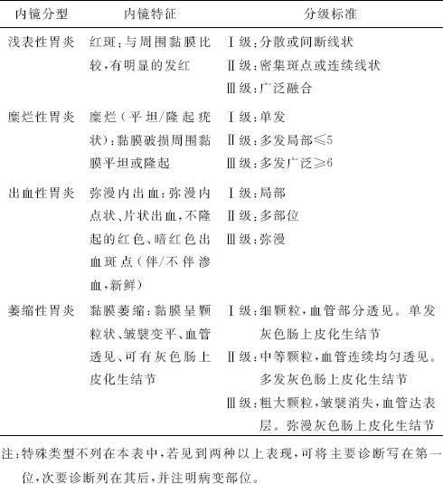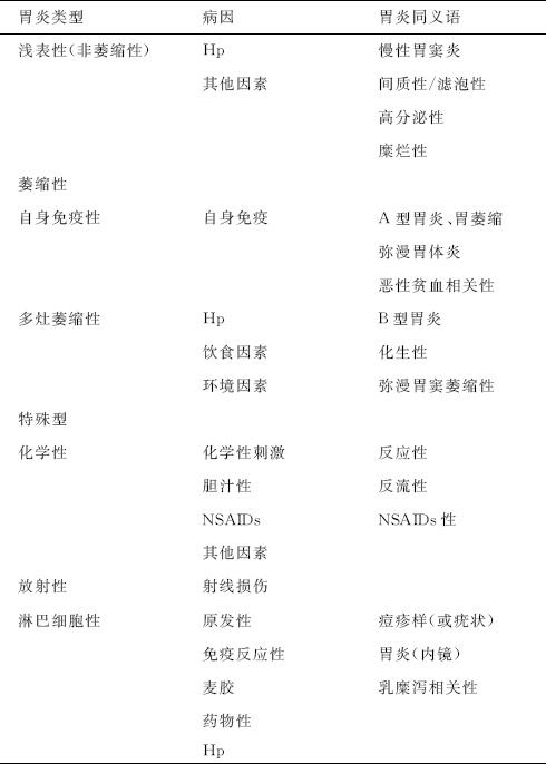 释义 | 胃炎 (一)急性胃炎 急性胃炎系由不同病因引起的胃黏膜急性炎症。病变严重者可累及黏膜下层与肌层,甚至深达浆膜层。临床上按病因及病理变化的不同,分为急性单纯性胃炎、急性糜烂性胃炎、急性腐蚀性胃炎、急性化脓性胃炎,其中临床上以急性单纯性胃炎最为常见,而由于抗生素广泛应用,急性化脓性胃炎已罕见。 1.病因及发病机制 (1)物理、化学损伤:最常引起胃炎的药物是阿司匹林、吲哚美辛等非甾体消炎药,磺胺类、铁剂、氯化钾、氨茶碱、糖皮质激素、某些抗生素、毛地黄毒苷均可刺激胃黏膜。进食过烫、过冷、太粗糙食物及射线过量照射可损伤胃黏膜。烈酒、咖啡、浓茶、辣椒等刺激性调味品亦可损伤胃黏膜。误服强酸、强碱可发生急性腐蚀性胃炎。胆汁反流可引起胆汁反流性胃炎。 (2)生物性感染:进食被细菌或其毒素污染的食物,可引起急性胃肠炎,也称食物中毒。致病细菌以沙门菌属及副溶血弧菌(嗜盐菌)、致病性大肠杆菌及金黄色葡萄球菌最多见。幽门螺旋杆菌(Hp)也致病。流感病毒、肠道病毒、误食毒蕈等有毒植物皆可损伤胃黏膜。化脓性胃炎(acute suppurative gastrms)又称急性蜂窝织胃炎(acute phlegrnonous gastritis),其病情严重,临床上十分少见,多由化脓菌通过血液循环或淋巴播散至胃壁所致。致病菌以溶血性链球菌最为多见,其次为金黄色葡萄球菌、大肠杆菌、产气荚膜杆菌等。 (3)严重创伤及重症疾病:大手术、大面积烧伤、脑创伤等严重创伤及感染中毒性休克,心、肺、肝、肾衰竭等重症疾病可引起急性应激状态而发生急性糜烂性胃炎。 (4)其他:情绪波动、患慢性心力衰竭、尿毒症、肝硬化等慢性疾患时有循环障碍均是急性胃炎内因。 目前对急性糜烂性胃炎病机未全明了,一般认为胃黏膜缺血和胃酸分泌是其重要的病因。 2.病理生理 (1)急性单纯性胃炎:胃黏膜呈浅表性炎症,黏膜充血、水肿,黏液及渗出物覆盖表面,可有点状出血及轻度糜烂、黏膜内有中性粒细胞浸润。 (2)急性糜烂性胃炎:胃黏膜呈多发性糜烂伴有点状或片状出血,组织学观察黏膜上皮坏死、脱落,固有层淋巴细胞、中性粒细胞浸润及水肿。急性胃炎的病变呈可逆性,一般2~3日修复。 (3)化脓性胃炎:严重化脓性炎症时,黏膜下层大量中性粒细胞浸润、黏膜坏死、血栓形成和出血。胃壁可呈弥漫脓性蜂窝织炎或形成局限的胃壁脓肿,并可发展至胃壁坏死和穿孔。 (4)急性腐蚀性胃炎:由于误服或有意吞服腐蚀剂(强碱如苛性碱,强酸如盐酸、硫酸、硝酸、苯酚、来苏)而引起的急性胃壁损伤,特别是在幽门前区。强碱所致损伤,食管比胃严重,而强酸则相反。强碱是一种强力脂质溶媒,故引起组织的液化性坏死;强酸凝固蛋白质,故引起凝固性坏死有灼痂。胃壁损伤程度与吞服的腐蚀剂剂量、浓度以及胃内所含食物量有关。 3.分类 急性胃炎常分为:急性单纯性、糜烂性、化脓性和腐蚀性胃炎。 4.临床表现 急性发病,上腹部疼痛及不适,恶心、呕吐,食欲不振等消化不良症状是急性胃炎共同表现。 (1)急性单纯性胃炎:如因细菌或毒素引起有集体发病或家庭发病的病史。一般在数小时至24小时发作。可出现恶心、呕吐,上中腹痛或不适,食欲减退。伴肠炎者出现脐周绞痛及腹泻。严重时伴发热、失水、酸中毒甚至休克。查体时上腹部可有压痛。伴有肠炎时脐周可有压痛,肠鸣音亢进。一般经1~2日痊愈。理化因素及进食某些药物引起者,依对胃黏膜损伤程度不同而病情不一。轻者为急性单纯性胃炎,出现急性胃炎共同表现,重则如大量饮酒、服阿司匹林等药物后可出现呕血、黑便,为急性糜烂性胃炎表现。 (2)急性糜烂性胃炎:多因严重创伤和重症疾病引起,以上消化道出血为主要表现。一般为少量、间歇性,可自止。但也可发生大出血而引起呕血和黑便,甚至休克。患者大多数是腹部不适、疼痛。消化不良症状常被原发疾病所掩盖而疏忽。体检可见面色苍白、上中腹轻压痛、心率加快,血压下降及原发病的体征。 (3)化脓性胃炎:以全身败血症和急性腹膜炎症为其主要临床表现,常有上腹剧痛、寒战、高热、上腹部肌紧张和明显压痛。尚可并发胃穿孔、腹膜炎、血栓性门静脉炎及肝脓肿。周围血白细胞增多,以中性粒细胞为主,便隐血可为阳性。 (4)腐蚀性胃炎:口腔、咽喉及胸骨后有烧灼感。上腹剧痛,并常伴有恶心呕吐。严重者胃壁坏死穿孔引起腹膜炎。强酸可在口、唇及咽部黏膜产生不同颜色的灼痂:硫酸致黑色痂,盐酸致灰棕色痂,硝酸致黄色痂,醋酸致白色痂。强碱则致黏膜的透明肿胀。 5.检查 (1)血象:由细菌感染者白细胞轻度增加。急性糜烂性胃炎出血量大者,红细胞和血红蛋白下降。 (2)便检查:由细菌感染引起胃肠炎者粪便可有少量脓细胞或红细胞。急性糜烂性胃炎出血后,便隐血试验阳性。 (3)细菌培养:由感染致病者呕吐物、粪便可发现致病菌。 (4)胃镜检查:如患者呕血、黑便原因不明时,在发病后24~48小时内进行胃镜检查,可发现胃黏膜损伤情况,如炎症、糜烂、出血灶等。急性腐蚀性胃炎急性期禁忌行胃镜检查。 6.诊断 根据病史,起病急,有上腹部疼痛、不适,恶心、呕吐,食欲不振等消化不良症状,一般可作出急性胃炎诊断。如有酗酒、严重创伤等病史,突发上消化道出血,可在48小时内作胃镜检查,胃部病变轻者仅有充血、水肿、糜烂和黏膜内出血;重者可