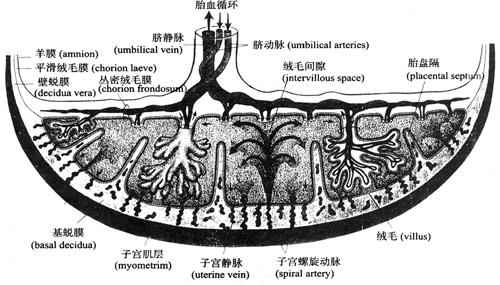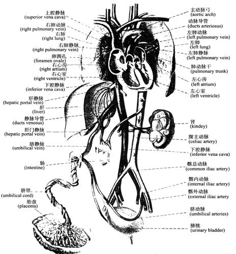 释义 | 胎儿血液循环径路 来自母体胎盘(placenta),富含氧和营养物质的血液经脐静脉(动脉血)入胎肝后,约有50%经静脉导管,另50%经肝门至肝静脉→下腔静脉(inferior vena cava)(下腔静脉还收集下肢、盆腔和腹腔的静脉血,因此其内的血液为混合性)→右心房小部分与来自上腔静脉和冠状窦的血液混合后进入右心室;大部分由下腔静脉瓣引导经卵圆孔(foramen ovale)→左心房,进入左心房的血液与来自肺静脉的少量血液混合后→左心室→由左心室输出的血液经主动脉及其各级分支至胎儿身体各部。小部分流入右心房的血液与来自上腔静脉和冠状窦的血液混合后→右心室→肺动脉干:小部分(10%)血至肺(由于胎儿肺尚未有呼吸功能,处于不张状态);其中大部分血经动脉导管(ductus arteriosus)→胸主动脉,在此与来自左心室血液汇合→腹主动脉,一部分血液供应胎儿躯干、腹腔和盆腔器官及下肢,大部分血液→髂总动脉→髂内动脉→脐动脉(umbilial artery)→胎盘(placenta),与母体血液进行物质和气体交换→脐静脉(umbilial vein)→胎儿(图6-50、图6-51)。 图6-50 胎儿血液循环示意图 图6-51 胎盘结构示意图 (箭头示血流方向。脐静脉富含氧和营养物质的血液,脐动脉含有二氧化碳和代谢废物的血液) |