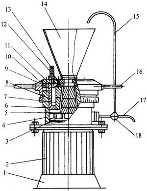 释义 | 胶体磨 (一)用途与特点 胶体磨与均质机一样均为细化物料颗粒的设备。主要用于乳化均质处理,可将物料粉碎成为极细微粒或小液滴分散在液体当中,制成均匀的乳化物,防止产品出现沉淀,提高乳状液的稳定性。该机主要零件材料选用不锈钢制造,耐腐蚀无毒,环状间隙可通过调整机构进行微量调整,并配有刻度盘,易于控制,装拆方便,容易清洗,占地面积小,自重较轻,操作简单,嗓音小,并配有冷却系统。 (二)结构与工作原理 胶体磨按结构和安装方式不同,分为立式和卧式两种。主要由进料斗、调节器、定齿盘、动齿盘、电机、减速器。图4-3-4为立式胶体磨结构,图4-3-5为卧式胶体磨结构。 图4-3-4 立式胶体磨 1-机座 2-电机 3-叶轮 4-磨体 5-动磨盘 6-静磨盘套 7-静磨盘 8-密封圈 9-限位螺钉 10-调节轮 11-盖板 12-联结螺钉 13-进、出冷却水管 14-料斗 15-循环管 16-调节手柄 17-出料管 18-三通阀 图4-3-5 卧式胶体磨 1-工作主轴 2-壳体 3-密封装置 4-出料口 5-动磨盘 6-静磨盘 7-调整手柄 8-挡盖 9-进料口 立式胶体的工作主轴与地面垂直,卧式胶体磨的工作主轴与地面平行。胶体磨由动、静齿盘组成工作件。动齿盘呈锥形,安装于主轴上,外表面有纵向的齿槽,由上至下分为粗、中、细三个环带,材料为不锈钢或硬质合金钢,表面硬度一般不低于HRC35-45。静齿盘固定于壳体上,呈倒锥形与动磨盘相对应,其中粗、中、细齿槽分成三个零件加工,然后装成一个整体,材料为不锈钢,齿面要经过硬化处理,动、静齿盘锥形齿槽面的接触面积大于50%,组装后同轴度误差不超过0.05mm。根据物料不同,两齿盘间隙可利用调整机构进行微量调节。当物料通过间隙时,由于动磨盘的高速旋转,使被加工物料通过其可变环状间隙时,在自重、离心力等复合作用下,物料间产生强烈的剪切、磨擦、挤压、冲压作用,从而使物料产生分散和乳化均质。均质后的物料细度一般为5~20μm,最细的物料直径可达1μm以下。 (三)主要技术参数(表4-3-2) 表4-3-2 胶体磨主要技术参数 注:河北廊坊通用机械厂、沈阳新光动机械厂、温州胶体磨机器制造厂等制造。 |