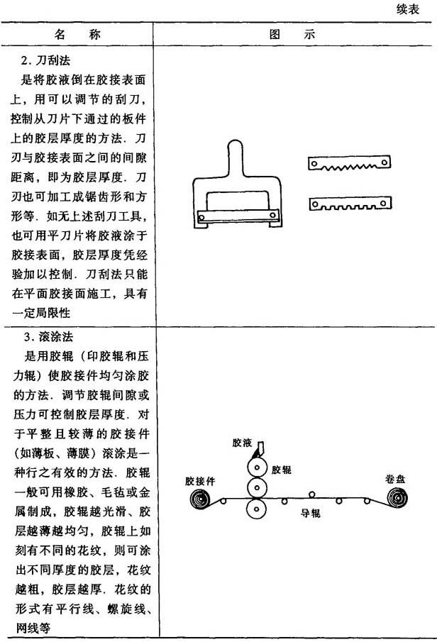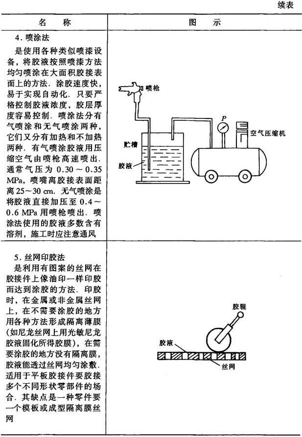 释义 | 胶粘剂的涂敷及固化 (1)前处理 前处理的步骤如表8-18所示. 表8-18 前处理的步骤 (2)涂敷 涂敷方法及图示如表8-19所示. 表8-19 涂敷方法及图示 (3)固化 胶粘剂的固化工艺对胶接质量有重大影响.固化工艺参数主要有压力、温度和时间. 固化压力有利于胶接表面的充分浸润,有利于排除胶粘剂固化反应时所产生的低分子挥发物,有利于排出胶层中残留的挥发性溶剂,有利于控制胶液的厚度.但固化压力有一定的范围,并随胶粘剂的种类而异.压力太校达不到加压的目的;压力过大,又会将胶液过多地挤出,反而降低胶接强度.施加压力的时间不宜过早,当胶液流动性还很大时,加压不能保证胶液厚度.最好在涂敷后放置一段时间,待胶液的粘度变大时,再施加压力,这在胶接工艺中被称为“预固化”. 固化温度有利于加速交联固化反应,并使固化更完全、更充分,并提高胶接强度.有利于胶粘剂与胶接表面之间的分子扩散.但温度过高,容易引起胶液流失,并导致交联固化反应过于剧烈而使胶层变脆,甚至造成基体分解碳化,从而导致胶接强度下降.因此在固化过程中,必须根据胶粘剂的种类,严格控制固化温度. 固化时间是指加压、加热或既加压又加热的情况下的持续时间.固化时间主要取决于溶剂挥发的速度,固化时胶层是否有副产物析出及析出量的多少,胶粘剂在固化温度下发生交联反应的速度等因素.不同类型的胶粘剂固化时间各不相同.固化时间的确定,应以保证胶接件基本达到胶接强度为原则. 固化时间与固化温度有着极其紧密的关系.升高固化温度可以缩短固化时间,这两者在一定范围内是相互依赖的. |