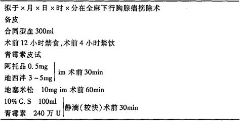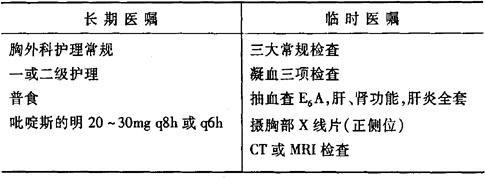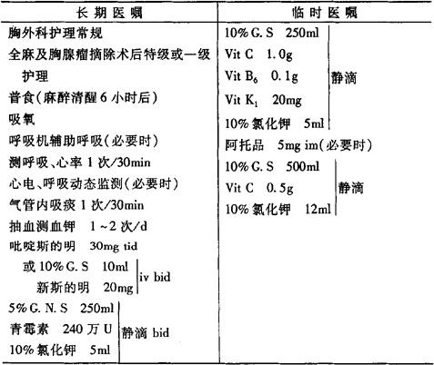 术前医嘱 手术医嘱 术后医嘱 说明:(1)胆碱能药物应由5mg开始逐渐加大剂量,以肌力明显恢复或几近正常为度,不可盲目大剂量,以免“胆碱能危象”发生。 (2)多数人认为:术晨应继续服用足够剂量的新斯的明或吡啶斯的明。 (3)术中术后不应选用氨基苷类抗生素,如庆大霉素、卡那霉素、链霉素等,以免加重肌无力。 (4)麻醉剂以氧化亚氮首选,一般不用肌松剂(卡肌宁除外),另外,吗啡、哌替啶等长效镇痛药物也应尽可能不用。 (5)术后应复查血钾并适当补钾,以防低钾及肌无力危象发生。 (6)术后72小时是肌无力危象及胆碱能危象发生的高峰期,故应密切监视并区分,以便及时正确对症处理。如出汗多、食管分泌物多、心率慢、肌肉抽动且静脉注射喜腾龙5mg,呼吸困难加重者,应考虑胆碱能危象,立即停用新斯的明等胆碱能药物,静脉注射阿托品或异丙肾上腺素(心动过缓者)或同时行机械辅助呼吸。 |