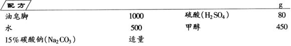 (3)甲酯化 油脚脂肪酸1000g加甲醇450g,滴加浓H2SO4 30g,在70~80℃间反应,并连续搅拌6~8h。反应完后,蒸馏回收过量的甲醇及反应生成的水,含水甲醇再通过蒸馏釜回收甲醇。最后反应产物再经真空蒸馏脱甲醇。脱去甲醇后,冷却,静置,分出硫酸用15%Na2CO3中和,静置,分层,分去水层后再经真空脱水至无气泡产生。然后再经连续减压薄膜塔蒸馏,收集真空度为2kPa,185~210℃的馏分,即为精制脂肪酸甲酯。