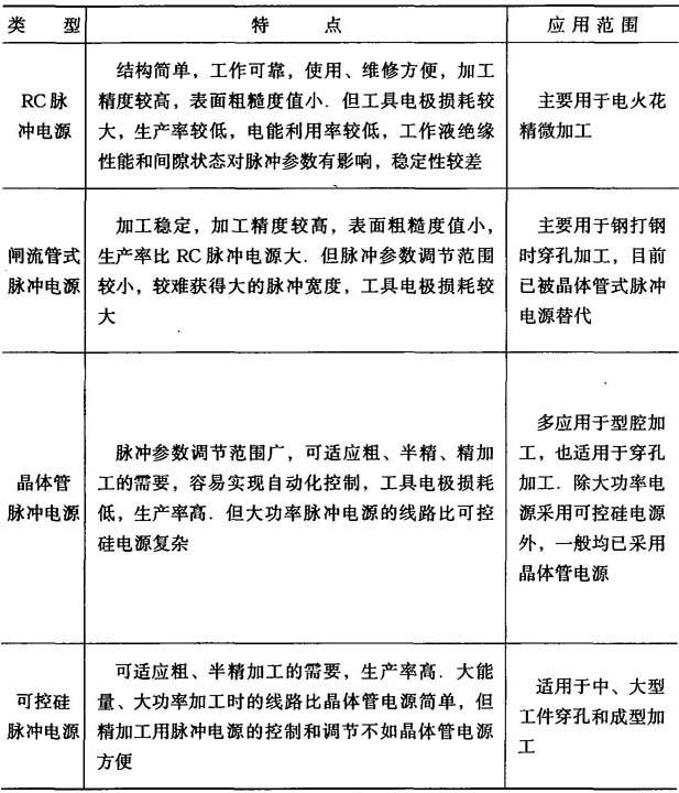 释义 | 脉冲电源 脉冲电源应满足以下工艺要求: ①脉冲电源应有足够的输出功率,以获得较高的加工速度; ②工具电极损耗校以保证加工精度; ③较小的加工表面粗糙度; ④脉冲参数调节简便,电源性能稳定可靠,维护方便. 表3-2是电火花加工用的各种脉冲电源. 表3-2 电火花加工用脉冲电源 |