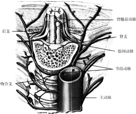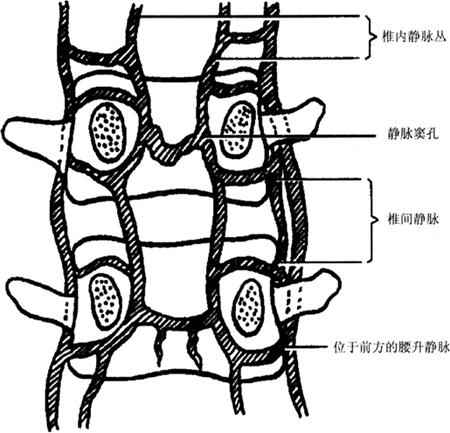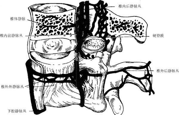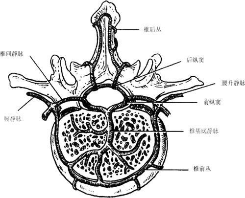 释义 | 脊柱的血供 一、脊柱动脉 脊柱动脉主要由主动脉发出的节段动脉供应,在胸段来自肋间后动脉,在腰段来自腰动脉(图1-50、图1-51)。在颈、骶段,这种节段性供应不明显。颈段主要来自椎动脉,在颈椎周围走行的由肋颈干发出的颈深动脉和甲状腺下动脉发出的颈升动脉也发支供应。骶段主要来自骶外侧动脉和骶中动脉,髂腰动脉也有分支参与。 图1-50 颈动脉与椎动脉(侧面观) 图1-51 胸段脊椎动脉 供应脊柱各段的动脉在相应椎间孔处发出腹外侧支、背侧支和脊前支(椎管前支)、脊后支(椎管后支),彼此在椎骨内外形成纵横相连复杂的动脉网。 (-)椎动脉(vertebral arteryy) 椎动脉与椎静脉伴行,在前斜角肌内侧起自锁骨下动脉,向上穿第6至第1颈椎横突孔,经枕骨大孔入颅腔,左右汇合成一条基底动脉(图1-50)。椎静脉由几支细小的静脉支组成,呈丛状,至颈5椎间孔处始合成一明显的静脉干。椎动脉位置较深,位于椎静脉的后内侧。在各椎间孔处,椎静脉接收来自内侧一较大的脊支和来自外侧一较小的与颈神经伴行的静脉支。 颈性眩晕常因椎动脉狭窄或梗阻致供血不全,与头颈活动有一定关系。 (二)腰动脉(lumbar artery) 腰椎的血供来自腰动脉。该动脉由腹主动脉的后壁发出,左右各4条,沿椎体的中部向后外侧行走,沿途发出一些小支进入椎体前方,以营养椎体。腰动脉至椎间孔前缘分为前支、后支及中间支。 前支分为升、降支,其分支与相邻上下分支形成纵行弓形网,吻合支的尖部与对侧相交通。由此发出至少1支骨内营养动脉,与由椎体前面进入的正中前动脉吻合,形成纵轴动脉。 后支在硬脊膜囊后外方供应硬脊膜及硬脊膜外间隙组织,其分支尚供应椎弓根、椎板、横突、关节突和棘突。 中间支供应神经袖,并穿过硬脊膜供应硬脊膜内神经根。 根据脊柱动脉与椎体及椎弓的位置关系,又可分为椎骨外动脉和椎骨营养动脉。 椎骨外动脉在椎体和椎弓的腹、背侧面形成4条有丰富吻合的动脉网: (1)椎体腹外侧动脉网:在椎体腹侧面,由各节段腹外侧支相连的纵横血管链,如绳梯状,在颈段及腰骶段尤为明显。在T3~L3间则呈弓形。 (2)椎体背侧动脉网:在脊柱各节段,脊前支从椎间孔进入椎管后,各在椎弓根下缘沿椎体背侧面分成升、降支,前者稍斜行。相邻脊前支的升、降支彼此吻合,全体形成连续近似菱形的吻合网,老年人因这种吻合中断,每个节段可作H形。 (3)椎弓腹侧动脉网:由各节段脊后支发出的升、降支及其分支吻合而成,管径较细而不规则。横突下缘有一支横突前动脉,位置较深,损伤后可产生腹膜后巨大血肿。 (4)椎弓背侧动脉网:由各节段动脉的背侧支吻合形成,位于椎弓板、棘突、关节突和横突的背面。吻合较为稀疏。 椎骨营养动脉又分为以下两支: (1)椎体营养动脉:①椎体背侧营养动脉,是供应椎体的主要营养动脉,由脊前支升支发出,多为1支,自椎体背侧中央的营养孔进入,沿水平方向呈直线走行,主干几无分支,至椎体中央部始反复分支,作放射状,供应相当于髓核投影的椎体中央部分;②椎体腹外侧营养动脉,由各节段动脉的腹外侧支分支发出,可为数支,自椎体腹外侧面中部的营养孔进入;③营养动脉周围支,来自动脉网中的骨膜支,可有10余支,由椎体外周向中央走行,分布于相当纤维环投影的椎体周围部分。 (2)椎弓营养动脉:①椎弓外面营养动脉,由椎管外面进入,来自各节段动脉的背侧支,集中于上、下关节突间,即峡部及其周围;②椎弓内面营养动脉,由椎管内面进入,来自各节段动脉的脊后支或椎弓腹侧动脉网,多自椎弓根椎弓板连接处中央或椎弓根下切迹后方的营养孔进入。椎弓营养动脉多为1支,本干较短,在内侧骨皮质深面又分为前后两支。前支较细,发支供应上、下关节突,横突和椎弓根;后支较粗,供应椎弓板和棘突。 二、脊柱静脉(veins of vertebral column) 围绕脊柱周围有丰富的静脉,按其所在部位分为椎外和椎内静脉丛。椎外静脉丛是在椎管外围绕脊柱形成的静脉丛,颈区特别发达,收集椎体及脊柱附近肌肉的静脉血。椎内静脉丛位于椎管内骨膜与硬脊膜之间的硬膜外腔内,收集椎骨、脊膜和脊髓的静脉血。椎内、椎外静脉丛互相吻合连通,最后分别注入邻近的椎静脉、肋间后静脉、腰静脉和骶外侧静脉等。脊柱的静脉丛上部可经枕骨大孔与硬脑膜窦相连通,下部可与盆腔静脉丛相交通,同时与颈、胸、腹、盆腔静脉的属支之间存有丰富而广泛的吻合,而且其血管口径和血流方向可随体位、腹压的改变而变化。因此,脊柱静脉丛是沟通上、下腔静脉系及颅腔内、外静脉的重要途径之一,在静脉回流中具有一定调节作用。然而,椎静脉系统属第4静脉系统,缺乏静脉瓣,血液可呈双向流动。来自腹盆腔的感染、肿瘤或寄生虫也可经脊柱静脉丛入侵颅内或其他远位的器官(图1-52)。 图1-52 脊柱的静脉丛 (-)椎体部静脉 (1)椎体(基)静脉:位于椎体中央,呈水平走行,与椎体营养动脉伴行,血管口径较粗,壁薄,在椎体周围上下,由多数平行面斜行的静脉汇集为垂直血管,再回流入椎体(基)静脉,全体如同灌木的根须。椎体(基)静脉向前以数支与椎外静脉前丛相连,向后以1或2支穿出椎体,注入椎内静脉前丛(图1-53)。 图1-53 椎基底静脉及其联系 (2)关节下水平集合静脉:位于椎体终板附近并与其平行,由终板下方口径较大呈水平走向的垂直静脉属支相连形成。此组静脉通过垂直静脉