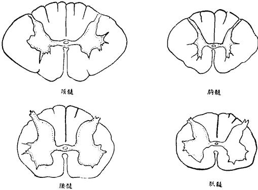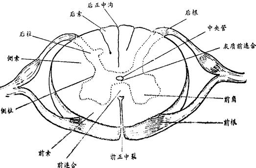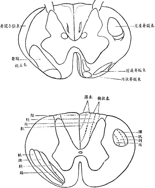 释义 | 脊髓 脊髓呈扁圆柱状,位于椎管内,上端于枕骨大孔处与延髓相续,下端缩细成脊髓圆锥,成人约平于第一腰椎下缘,小儿稍低,约于第二腰椎平面。故椎管下部无脊髓,而以腰、骶神经根所形成的马尾为主。 脊髓外面有三层被膜,并有齿状韧带与神经根,将脊髓固定于椎管内。 成人脊髓长约45厘米,其表面虽无分节现象,但根据脊髓的功能,把每对脊神经前、后根附着范围,划为一个脊髓节。共分为颈髓8节、胸髓12节、腰髓5节、骶髓5节和尾髓1节。脊髓全长,粗细不匀,颈部膨大处称颈膨大,腰部膨大处称腰膨大,分别管理上、下肢运动(图11、12)。 图11 脊髓不同部位横断面 图12 脊髓横断面 脊髓前中线有前正中裂,后中线有后正中沟。沟裂两侧各有成对的神经。脊髓节内前角细胞发生的轴突,组成该脊神经前根。后根纤维,进入后角。前、后根在椎间孔处合并,组成脊神经,包括运动与感觉纤维。 脊髓在发育中,较脊柱为慢,故成人的脊髓与脊柱节段不等,脊髓短于脊柱。颈部和上胸部脊髓节段,比相应的脊柱高一椎骨。中部胸髓则高两个椎骨,下胸髓高出三个椎骨。1~5腰髓相当于10~12胸椎体,骶、尾节集中于圆锥部,相当于腰1椎下缘。 脊髓横切面的内部结构:中央部为中央管,中央管周围为蝶形的灰质,主要由神经细胞组成,其周围为白质,主要由神经纤维组成。灰质向前方突出的部分叫前角(纵贯脊髓全长形成前柱),向后方突出部分叫后角(纵贯脊髓全长形成后柱)。前角内运动神经元,发出纤维(轴突)组成前根,后角内含有中间神经元,接受来自后根的纤维,其轴突分两支,一支达前角细胞,参与简单反射弧通路;另一支向中枢传递感觉冲动,组成上行神经束(脊髓视丘前束、脊髓视丘侧束)。在脊髓的胸、腰段前、后角之间有侧角(纵贯脊髓为侧柱,内为管理内脏神经的神经元),其轴突随前根走出,构成植物神经的节前纤维。 脊髓白质,被前、后根分为前索、侧索和后索。主要由上行(感觉)和下行(运动)纤维所构成。前根与前正中裂之间的白质称前索,前、后根之间的白质称侧索,后根与脊后正中沟之间的白质称后索。 前索:主要的下行纤维是皮质脊髓前束,下行到相应的脊髓节段附近,交叉到对侧支配前角细胞,主要的上升纤维有脊髓丘脑前束(传导部分触觉)、前庭脊髓束(平衡反射)、顶盖脊髓束(视听反射)、内侧纵束和部分网状脊髓束。 侧索:主要有脊髓丘脑束(传导痛、温、触觉的上行束)、皮质脊髓束(传导运动冲动的下行束)、脊髓小脑束,红核脊髓束等。 后索:主要有传导深感觉和部分触觉的薄束与楔状束(图13)。 图13 脊髓传导束分布图 |