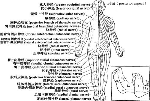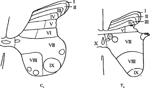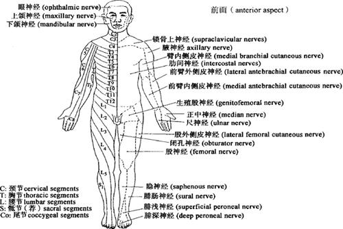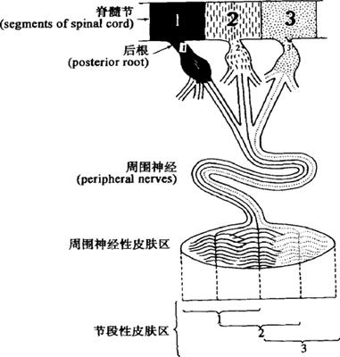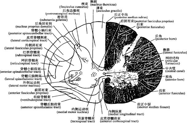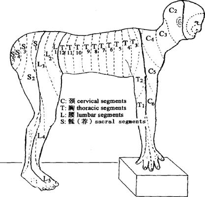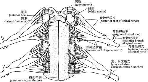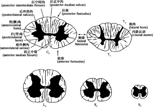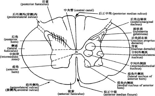 释义 | 脊髓的形态结构 脊髓(spinal cord)位于椎管中,成人长约42~45cm,呈前后略扁的圆柱形。其上端从内部结构和外形上看与脑并无明显的界线,但通常人为地以平齐枕骨大孔处,或第1对颈神经的最上根线,或锥体交叉的最下端作为脑与脊髓的分界线;下端逐渐变细称脊髓圆锥(conus medullaris)。成人男性第1腰椎下缘平面;女性约平第2腰椎下缘,新生儿可达第3腰椎下缘(图12-1)。 (一)脊髓的结构 横切面可见到主要有以下几个明显的形态特征(图12-5): 图12-5 脊髓各段横切面,示灰、白质分布概况 (1)脊表面有6条不很明显的沟和中央管(central canal),即前、后各一的前正中裂(anterior median fissure)、后正中沟(posterior median sulcus),它把脊髓分成左、右对等的两半;两侧有对称的前外侧沟(anterolateral sulcus)和后外侧沟(posterior intermediate sulcus),分别有前根和后根出入。 (2)灰质(gray matter)、白质(white matter)轮廓清晰易于区分。从图12-6看出灰质主要为神经细胞,位于脊髓中央,形似“H”形或蝴蝶形,可区分:前角(柱)(anterior horn or column),其内主要为运动神经元,其轴突形成前根(anterior root);中间带(intermediate zone)及后角(柱)(posterior horn),主要为感觉性的中枢细胞。中间带有中间内侧核(intermediomedial nucleus)和外侧核(intermediolateral nucleus)。内侧核见脊髓全长,可能接受内脏传入纤维,并传达至内脏的运动神经元;外侧核仅见于C8~L2~3,属于交感神经节前神经元。白质位于灰质的周围,主要为上、下行传导束,依表面的沟可粗分为前索(anterior funiculus)、侧索(lateral funiculus)和后索(posterior funiculus)。每个索又有许多功能相同的上、下行传束(图12-7),如侧索内的皮质脊髓侧束(lateral corticospinal tract)、后索内的薄束(fasiculus gracilis)和楔束(fasiculus cumeatus)等。 图12-6 脊髓表面的沟、裂,灰、白质结构示意图 图12-7 脊髓切面结构示意图 (3)脊髓各段的结构基本相同,但头、胸、腰、骶各段在灰、白质的分布、外形和灰质相对量上则有差异。在颈膨大(cervical enlargement)和腰膨大(lumboscaral enargement),灰质量极度扩大,胸段灰质薄弱,白质相对较多(图12-5);由于脊髓各段均以长的升降纤维与脑相连,因此越至高的节段白质也越多,所以第1颈段的白质纤维最多。 (4)脊髓切面的结构较明确,以前正中裂、后正中沟通过中央管的假想连线,无论在白质或灰质在结构和功能上均可将脊髓区分为对称的两半。熟悉这一点在神经系统疾病定位诊断有重要的参考意义。 (5)脊髓灰质构筑的分层:自Rexed(1952)以神经元的形态、大小及排列,认为脊髓灰质也似大、小脑皮质细胞,同样可分为若干层,提出脊髓灰质分层概念,即板层构筑学(laminar architecture)以来,通过各方面的研究,较普通认为一切高等哺乳动物包括人类亦有类似的分层。由后往前大致可分为10层(图12-8):第Ⅰ~Ⅵ层相当于后角,与感觉传入有关,其中Ⅰ~Ⅳ层为后角的头,第V层为后角颈,第Ⅵ层为后角基部;第V、Ⅵ层又可分为内、外侧部,第Ⅵ层在两膨大部发育明显。第Ⅶ层相当于中间带,此层有中间内侧核及中间侧核,在胸腰段还有与内脏运动有关的交感神经节前神经元。第Ⅷ~Ⅸ层相当于前角,其中有小型的γ神经元,大型的α细胞及其他神经元。第Ⅷ层的胸段脊髓横过全部前角,但在其他节段仅占前角内侧区。第Ⅸ层占据前角最前部,在颈、腰膨大部,由于神经细胞数量增多,故向外侧和后侧扩展。第X层位于中央管周围,内含小型神经元和胶质细胞。 图12-8 脊髓灰质分层示意图 (二)脊髓节段 脊神经根可作为区分脊髓节段的标记。即每一对脊神经根相连的那一段脊髓为一个脊髓节段(segments of spinal cord)(图12-9)。脊神经有31对,故相应的也有31对脊髓节。每一段脊髓节包括相应节段的灰质、白质、脊神经根、脊神经及其所支配的肌与皮肤。其中人体皮肤感觉神经节段性分布在四肢较复杂,但在胸腹部表现得最为明显。自锁骨和胸骨上缘起始至腹股沟韧带为止,每个节段脊神经皮支都自背部中线至腹部中线横行的环带依次有序的排列(T1~L1)(图12-10、图12-11)。 图12-9 脊神经及脊髓节段示意图 图12-10 皮肤的脊神经节段性分布示意图(腹侧) 图12-11 皮肤的脊神经节段性分布示意图(背侧) 如果使人像图12-12所示那样四肢着地,此时人好像动物一样,口、鼻在前端,而会阴在后端(尾),使皮肤感觉性分布更符合胚胎发生时皮节(dermatomes)向远端推移的原始情况。我们再人为地在身上用四条垂线,即顶耳前线、经上肢外侧至小指的平分线、经腹股沟线、下肢外侧平分线,加以划分:经耳前的垂线以前的头面部为三叉神经分布;经耳前的垂线至上肢后外侧平分垂线之间的部分由颈神经(C2-8)分布;上肢平分线至腹股沟线之间为胸神经分布,腹股沟线至下肢外侧平分垂线之间的部分由腰神经分布;下肢平分线以后为骶神经分布。用这种姿势记忆皮肤感觉性分布既容易理解,也便于应用。 图12-12 四肢着地,皮肤感觉的脊神经节段性分布示意图 在熟悉人体皮肤节段性分布的概况后,从很有特征的、呈带状形排列的带状疱疹(Herpes zoster),借肋间神经明确反映出病变的节段,是理解皮肤神经节段性分布最典型的例子。但必须明确,脊髓是一个连续性结构,它们之间的支配是相邻节段,有如叠瓦一样不完全地相互重叠。所以,当某一节段神经受损时,不会引起相应的皮节完全丧失感觉(anesthesia),而仅是部分感觉丧失(hypoesthesia)。一般认为,当