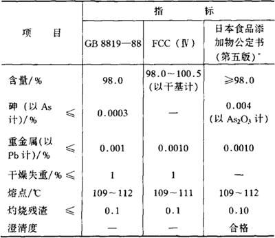 释义 | 脱氢乙酸 别名 脱氢醋酸DHA 编码 GB 17.009;INS 265 化学结构 C8H8O4 相对分子质量 168.14 性状 无色至白色针状或板状结晶或白色结晶性粉末。无臭,略带酸味。熔点108~111℃(升华),沸点269.9℃。易溶于固定碱的水溶液,难溶于水,1g约溶于35mL乙醇和5mL丙酮。脱氢乙酸饱和水溶液pH等于4。 制法 (1)由双乙烯酮在催化剂存在下的惰性溶剂中发生二聚反应制得。 (2)由乙酰乙酸乙酯在碳酸氢钠作用下制得。 质量标准 *日本食品添加物公定书〈第六版〉无此品种。 鉴别方法 (1)取本品0.1g,加水1mL,加水杨醛-乙醇溶液(1+5)3~5滴和0.5mL氢氧化钠溶液(1+2),在水浴中加热时呈红色。 (2)取本品的乙醇溶液(1+100)1mL,加水1mL、酒石酸钾钠溶液(7+50)3滴和乙酸铜试液2滴(取乙酸铜13.3g加乙酸5mL和水1951mL溶解)摇匀,生成带红紫色的沉淀。 毒理学依据 1.LD50 大鼠口服 1000mg/kg(bw)。 2.GRAS FDA-21CFR 172.130。 使用 防腐剂。 1.使用注意事项 (1)脱氢乙酸是广谱防腐剂,特别对霉菌和酵母菌的抑菌能力强,为苯甲酸钠的2~10倍。 (2)脱氢乙酸离电常数较低。尽管其抗菌活性和水溶液稳定性随pH增高而下降,但在较高pH范围内仍有很好的抗菌效果,当pH大于9时,抗菌活性才减弱。 (3)脱氢乙酸主要是抗酵母菌和霉菌,在高剂量时才能抑制细菌。脱氢乙酸或其钠盐与过氧化氢水溶液混合使用,抗微生物活性显着增强。 2.使用范围及用量 (1)我国《食品添加剂使用卫生标准》(GB 2760-1996)规定:脱氢乙酸可用于腐乳、酱菜、原汁橘浆,最大使用量为0.30g/kg。 (2)实际使用参考: ①我国台湾省和日本规定:允许在人造奶油、奶油和干酪三种食品中添加0.5g/kg以下。 ②美国规定:允许用于处理切块或者去皮南瓜中,最高残留限量为65mg/kg。 ③前苏联规定:作为杀菌剂用于处理新鲜蔬菜、水果,也用于浸泡包装材料及酿酒。 |
