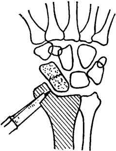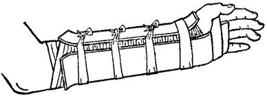 释义 | 腕舟骨骨折 腕舟骨骨折是腕骨中最易发生骨折的一块,约占全身骨折的1%,按骨折部位可分为腰部骨折、近端骨折、结节骨折、舟骨折并经舟骨月骨周围腕骨脱位(图10~67)。 图10~67 经舟骨月骨周围腕骨脱位 【症状与诊断】 鼻咽窝肿胀、压痛,腕关节桡偏,或叩击第二掌骨头时出现腕部剧烈疼痛,如合并经舟骨月骨周围腕骨脱位,则有明显畸形,应摄腕关节正、斜位X线片,明确骨折类型。 【整复手法】 单纯舟骨骨折多无移位,无需整复,主要在于要有良好的固定。但对合并经舟骨月骨周围腕骨脱位者,则需手法复位。前臂旋前位,一助手握前臂上段,另一助手分别握拇指和四指,对抗牵引。术者双手食、中、无名指重迭,抵住腕掌侧上部,两拇指由背侧向掌侧按压头状骨和三角骨即可复位。 【固定方法】 一、器材:腕掌、背侧弧形板(上端达前臂上1/3,下端平掌骨头,宽6厘米,向背侧弧25度)各1块,腕桡侧弧形板(上端达前臂上1/3,下端平第一掌骨头)1块,尺侧板(上达前臂上1/3,下平尺骨茎突)1块(图10~68),梯形垫1个,小平垫1个,布带、绷带、胶布等。 图10~68 腕舟骨骨折夹板 1.尺侧板 2.桡侧板 3.背侧板 4.掌侧板 二、方法:助手牵引维持于腕关节背伸25度,尺偏10度,拇指对掌位。四层绷带环绕局部。腕掌部放梯形垫,第一掌骨基部背侧放一平垫,胶部固定。先放掌、背侧板,再放桡、尺侧板,腕上缚三条布带固定,掌部用两条胶布固定(图10~69)。 图10~69 腕舟骨骨折小夹板固定法 三、固定时间:腕舟骨血运差,愈合慢,易发生迟缓愈合、不愈合及无菌性坏死。腰部与近端骨折固定时间要适当延长,至少需要两个月,个别病例需要更长时间,只要断端没有明显的吸收硬化,仍有愈合可能,应继续外固定,作者曾见一例,经九个月固定而获得愈合。 【注意事项】 一、舟骨骨折有时临床症状较明显,而早期X线片显示不出骨折线,不可轻易否定骨折的诊断,应按骨折处理,固定两周后再摄片复查,如仍未见骨折线方可排除骨折。 二、舟骨骨折固定时间较长,必须注意指导病人积极进行肩、肘、掌指及指间关节功能锻炼。 三、舟骨血液供应来自尺桡动脉的分支,由舟骨结节进入骨内,近段1/3均被关节软骨所包绕,没有血管从此进入。当腰部和近端骨折时,其近侧骨块易发生无菌性坏死,出现腕关节疼痛,影响功能时,可行舟骨切除术。 四、舟骨腰部骨折,经长期固定,不愈合者,如无疼痛及功能障碍者无须治疗,如有疼痛,影响功能者可作桡骨茎突切除术。 【附】 桡骨茎突切除术 鼻咽窝正中纵切口,长5厘米,切开深筋膜,保护桡神经浅支,将伸拇长肌腱拉向背侧,伸拇短肌腱和外展拇长肌腱拉向掌侧,将腕关节尽量尺偏,切开腕桡韧带及关节囊,即可见到舟骨骨折线及桡骨茎突。用利凿切除桡骨茎突,切除范围要超过骨折线上0.2厘米,距桡骨茎突尖约1厘米(图10~70)。术后石膏托固定两周。 图10~70 桡骨茎突切除术 |