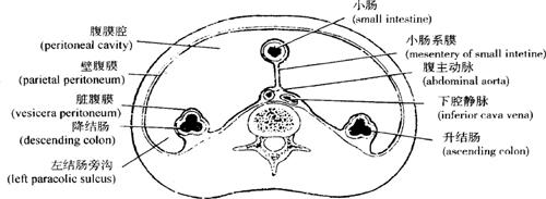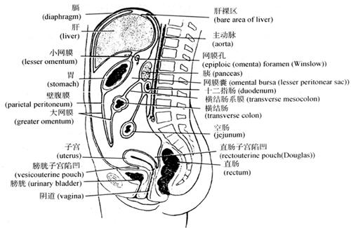 释义 | 腹膜及腹膜腔 (一)腹膜的概况 腹膜(peritoneum)是人体内面积最大、配布最为复杂的浆膜,表面光滑湿润,薄而透明,由单层扁平上皮及其深面的结缔组织构成。它衬覆于腹盆腔的内表面以及腹盆腔脏器的表面。其中位于腹、盆腔壁内表面者称为壁腹膜(parietal peritoneum)或腹膜壁层(parital layer),覆盖脏器表面的腹膜称为脏腹膜(vsical peritoneum)或腹膜脏层(vesical layer)。壁腹膜与脏腹膜互相移行,并形成极不规则的潜在性间隙称腹膜腔(peritoneal cavity),临床上习惯称之为“腹腔”。其中男性腹膜腔完全封闭;女性则不然,借输卵管腹腔口→输卵管→子宫→阴道→与外界相通。由于有这样的解剖联系,可能是女性患原发性腹膜炎、盆腔炎较常见的原因之一。“输卵管通气术”(tubal insufflation or Rubin’s test)也是利用这一解剖特征,将空气注入子宫腔内,观察有无经输卵管进入腹膜腔后上升达膈下的游离气体,作为评估输卵管是否通畅的依据之一;或以空气注入法疏通有粘连狭窄的输卵管,以达到恢复畅通。 据估计腹膜的表面积约为1.7~2.2m2,与身体的表面积相当,但实际上有功能的交换面积略低于1.0m2。因而当腹膜腔感染时可给身体带来极其严重的影响。例如:腹内脏器穿孔如急性阑尾炎穿孔、胃-十二指肠溃疡穿孔或阑尾炎(appendicitis)、憩实炎(diverticulitis)等所致的急性弥漫性腹膜炎(acute dtiffuse peritonitis)等,都将引起腹膜的病理系列改变。若处理不及时或治疗不彻底都将导致严重后果。 腹膜壁层配布虽然广泛,但实际形态简单而且起伏不大,多按其局部位置而命名,如膈腹膜,腹前、后壁腹膜等等,易于记忆。然而在某些局部,腹膜壁层与腹壁的联系较松散。例如腹前壁下部和盆腔前壁的腹膜壁层,当膀胱充盈而膨胀上升时,可逐渐远离腹前壁下部,为尿道阻塞时沿耻骨联合上缘穿刺膀胱排尿而不触及腹膜的解剖学依据。也不难理解,当要进行膀胱肿瘤或异物摘除,常规要向膀胱内注入无菌生理盐水,目的是使膀胱充盈后再做耻骨上膀胱造口术,这是其可以完全在腹膜腔外进行操作的解剖学基础。但腹膜脏层(vesical layer)则与之相反,形态多样变化较大,脏层与器官的联系较紧密,尤其是消化管,它使消化管在作对端吻合(端-端吻合)后可达到“水密”(water-tight)的效果。这一点在外科上有重要意义。正因为这样,手术中要处理好无腹膜覆盖面;尽管有时创面甚窄,但在肠道外科中也是十分关键的步骤。根据腹膜与覆盖脏器的关系,通常分为三类,即:①腹膜内位器官(intraperitoneal organ):指器官几乎完全被腹膜覆盖,如胃、空肠、回肠、横结肠、脾等;②腹膜间位器官(intermediaperitoneal organ):指器官大部分被腹膜覆盖,如升结肠、降结肠、肝、子宫等;③腹膜外(后)位器官(externaperitoneal(retroperiteneal) organ):指腹膜仅覆盖器官的一部分,大部分没被腹膜覆盖,如肾、胰、十二指肠降部等。但有不少学者,如Cunningham、Graft等并不把“腹膜间位”和“腹膜外位”视为两种类型腹膜关系的器官,而将它们统称为“腹膜后位器官”(retroperitoneal organ)(图9-50)。 图9-50 腹膜(女性正中矢状切) 腹膜的配布虽然复杂多样,但在熟悉腹部脏器位置的基础上,按腹部正中矢状切面、横切面(图9-50、图9-51、图9-52)进行观察,还是有规律可循的。腹部壁层的分部以及包被脏器概况泾渭分明,也较易理解壁层腹膜过渡至脏层腹膜或脏层腹膜移行至器官所形成多种结构,如系膜(mesenterium)、网膜(omentum)、韧带(ligament)、皱襞(fold)、陷窝(excavatio)、间隙(space)等。 图9-51 腹膜腔经网膜孔横切面 图9-52 腹膜腔经下腹部横切面 (二)腹膜的功能 1.腹膜的分泌功能 正常的腹膜腔容量极小,仅有数毫升由腹膜分泌的液体称为腹膜液(peritoneal liquor),以湿润脏器表面,使脏器活动时,如呼吸运动或蠕动可减小脏器间的摩擦。但在疾病中,如肝硬化(cirrhosis),则可产生大量积液称腹水(ascites),有时可达数升。正常情况下腹膜腔内的液体不是静止隔离的,而是不断地进行更新交换。其形态学基础是;腹膜犹如一半透性膜(semipermeable membrane)可容许腹膜腔内的液体成分可以和血液进行交换。腹膜透析(peritoneal dialysis)正是利用这一结构特点,向腹膜腔内灌注特定的液体,借此析出血液中的代谢产物,以暂时代替肾的功能。目前认为腹膜腔内液体主要是通过淋巴管吸收,而淋巴管主要是膈淋巴系统。并认为膈淋巴系的淋巴管为单方向流动的结构,只允许从腹膜腔内吸收液体而不能反流。而膈下区又是腹膜腔内吸收最活跃的场所(图9-53)。有人将细菌注入实验犬的腹膜腔内,6分钟后细菌便出现在胸导管(thoracic duct)的淋巴液中,12分钟后血液中出现细菌,足以说明急性弥漫性腹膜炎(acute diffuse peritonitis)时,腹膜腔内的淋巴引流在吸收细菌及毒素方面的重要意义。因而在20世纪初Fowler(1900)便提出,在弥漫性腹膜炎时宜采用半坐卧位,使感染物沉积于盆腔内,以期减少细菌和毒素的吸收,故被称为Fowler半坐卧位。但目前也有不同意见,通过动物实验和临床观察,认为腹膜腔各部位的吸收能力并无差别。术后采取Fowler半坐卧位,其目的在于尽量使腹膜腔感染局限于下腹部,此乃由于下腹膜腔的感染,对机体影响较轻,且处理亦较上腹部为易。 图9-53 腹膜内液正常流向示意图 2.腹膜的反应性和修复功能 腹膜具有强烈的反应性,病理情况下稍受刺激即起反应。当腹膜受到细菌感染或化学物