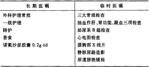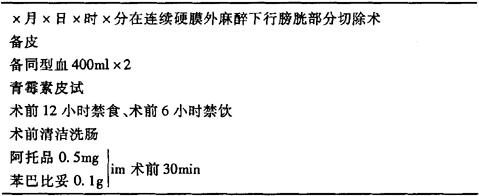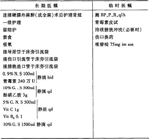 术前医嘱 手术医嘱 术后医嘱 说明:(1)如果行输尿管移位,应于术后1个月内拔除输尿管支架管。 (2)保留膀胱手术后病人应严密随诊,每3个月膀胱镜检查1次,一年无复发者酌情延长复查时间。 (3)术后膀胱内灌注化疗或免疫治疗药物可预防或推迟肿瘤复发。常用药物有BCG、噻替哌、丝裂霉素C、表阿霉素等,方法是将药物用蒸馏水或等渗盐水稀释至30~40ml,灌入膀胱内,保留2小时,每15分钟仰、俯、左右侧位更换体位。 |