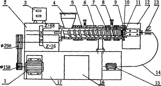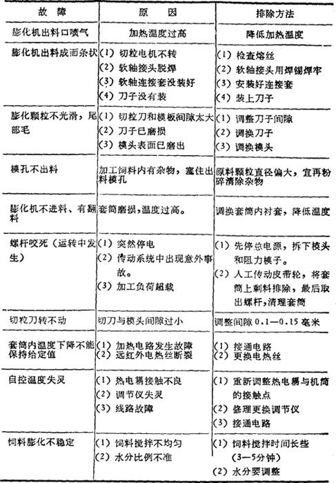 释义 | 膨化颗粒饲料机 (1)主要结构及操作工艺 上海、无锡、宁波等地生产的膨化颗粒机主要由进出料斗、膨化造粒腔、切粒机构、远红外辅助电加温时控装置、传动减速机构及机架等六大部分组成(图5-9)。 图5-9 膨化机结构图 1.主电动机J03-160S,15瓩,1460/转/分;2.减速箱;3.自动温度控制箱;4.加料斗;5.套筒;6.远红外加热元件;7.螺杆;8.温度表;9.模头锁紧螺帽;10.模头;11.切粒刀;12.出料斗;13.软轴锁紧手柄;14.软轴;15.切粒电动机J03-801,0.75瓩,1410转/分;16,电器控制箱;17.机架 膨化造粒腔是膨化机的主要工作部件,直接影响到膨化机的膨化性能和产量,同时也涉及到膨化机使用寿命的重要因素之一。造粒腔由三大部件组成:螺杆、外套筒、内套筒。螺杆由头、中、尾三段组成,三段用剪切凸肩连为整体。螺杆螺纹从头至尾的螺距是渐变的,螺纹深度也各不相同,而外径等同。 螺杆第一段称为进料段,螺槽较深,其主要作用是将配合原料定量向螺杆中段输送,产生挤压力。第二段称为捏和段,螺槽较前段浅,其作用是将输送来的原料进行压缩,并不断搅拌和捏和,在螺旋的剪切力作用下,物料分子间相互摩擦升温,使原料形成面团状,并含有大量蒸汽,为下段膨化作准备。第三段为段化段,螺槽更浅,由于这段螺纹压缩比大,剪切力大,物料间摩擦更激烈,捏和更充分均匀,使原料从面团状复性到粘流状。为了延长螺杆使用寿命,有关单位采用了喷焊步法工艺。目前喷焊后的螺杆工作寿命达1000小时以上,加工饲料25万斤以上。 整个造粒腔由两节外套筒用螺钉联接而成,整个造粒腔由四节内套筒用螺钉定位在外套筒上。 膨化颗粒饲料机的套筒是膨化造粒腔储存原料的容器,能承受100公斤/厘米2的压力,内套开螺槽是增加原料之间的摩擦力,防止螺杆抱料空转。 (2)主要技术性能(SLP-75型) 螺杆驱动功率:15千瓦 螺杆直径:75毫米 螺杆转速:180转/分 加温配备功率:7.2千瓦(生产前15分钟加温耗电量为7.2千瓦,实际生产中的耗电量为3千瓦) 切刀功率:0.75千瓦 淀粉含量:25%左右 产量:100-125公斤/小时 膨化率:95%以上 浮性率:95%以上 漂浮时间:16小时以上 模孔规格:Φ2.5、Φ3.5、Φ5毫米 外形尺寸:2100×550×1500毫米 长径比L/D:12 重量:800公斤 生产膨化饲料的必要条件是: 温度:125℃-150℃; 压力:40-60公斤/厘米2; 水分:25-30%(总含水率); 淀粉:20%以上。 (3)成形工艺 含有一定量的淀粉质配合饲料原料,经搅拌机加水拌匀从加料斗进入造粒腔主体,由于螺杆、物料与套筒之间不断地产生挤压、剪切、摩擦作用,使筒内的工作压力与温度逐渐升高,水分均匀地分布在物料中,并使物料形态成粘流状,随着螺旋面旋转推向模头,当处于高压、高温状态下的物料经模孔喷出时,因机筒内压力、温度及大气中的压力、温度相差很大,使物料中水分迅速蒸发,体积开始膨胀至360克/毫升左右,即成为膨化饲料。 使用前准备: ①原料预先粉碎,清除金属屑末及硬性杂质。 ②粉碎后的原料按配方的配比、定量加水搅拌3-5分钟,使含水率达到25%-30%,如谷物膨化原料(大米、玉米等),它的含水率应在14%左右,但升机时需要用含水率50%原料作引料,引料1.5-2.5公斤即可。 ③开车前观察齿轮箱指示窗上的油面线(需超过)。 ④开车前装上清理干净的阻力模板和出料模头,用锁紧螺母把模头紧固在套简上,然后装上轮轴,将定位销锁住,装上出料斗。 ⑤开车前,调节好“温度指示调节仪”的定位指针(红色)至配合饲料或谷物食品所需要的温度,调节好移动指针(黑色)和车间内气温相同的度数。 操作顺序: ①接通电源开关,电压表读数应在350-400伏之间可以开车,低于350伏不能开车。 ②用10-15分钟先将加热系统温度控制在130度左右,不能低于100度(模孔处),也不能高于180度。对于某些淀粉含量较低的配方,套筒起始温度稍高,应控制在150-180度。 ③随着不断加热,指示温度的黑色指针逐步向红色指针移动。当两针重合时,加温自动停止,指示灯由绿变红。此时应观察目测温度表上的度数和自动温控度数是否相同,一般误差在±10度。 ④空车运转不宜超过一分钟,正常启动后须将引料立即加入,然后将搅拌均匀的粉料装满料斗,均匀地进入套筒。 ⑤饲料加工过程中,随时观察电压电流变化,尤其是电流变化。主电机工作电流一般在25A-27A,远红外加温电流15A(每组7.5A),总电流不应超过50A。 停机顺序: ①加工完毕前2-3分钟,先将“两位控制按钮”复回原位,温度指示调节仪的红、绿指示灯均熄灭,然后停止切粒电机,直至套筒内剩料挤完(即模孔不出料),再停止主电机的运转。 ②停车后先拆卸出料斗和切刀软轴,然后用月牙板手将锁紧模头的锁紧螺帽松2-3圈,待机筒内的高压蒸汽先放后再拆下锁紧螺帽和模头。 ③正常工作状态和拆卸模头时,不应站在模头正前方,注意安全。模头拆下后,用膨化过的颗粒料回加进料斗,开车2-3分钟,推出阻力模板,使套筒、螺杆中的残料排除。 ④剩料排除后不必拆出螺杆,下次可以直接启动开车。如需拆卸清理螺杆,螺杆应吊放。在第二次开车前应先将清理干净的螺杆装入套筒,推到根部将内外键槽衔接到规定部位。如新机使用较紧时,可用铁锤敲几下,但需用木块垫在螺杆顶部。 ⑤清理干净阻力模板、模头、模孔、出料斗及整机,下次使用。 (4)一般故障及排除方法 见表5-8。 表5-8 故障产生原因及排除方法 |