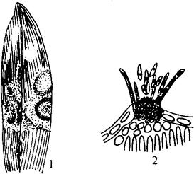 释义 | 花叶万年青炭疽病 【症状】 病菌多从叶尖或叶缘侵入。开始为杏黄色至褐色针头状小点,逐步扩展为不规则形状、灰白色病斑,偶有隐约可见云纹,外围有1圈水渍状灰绿色环带。病斑最后软腐干裂,散生黑色小点,即病原菌分生孢子盘(图10-4)。 图10-4 花叶万年青炭疽病 1.症状 2.病原菌的分生孢子盘及分生孢子 【病原】 为Vermicularia sp.。分生孢子盘垫状,散生,突出表皮,较黑。刚毛多根,混生于分生孢子梗间,黑褐色,分隔不明显,大小28.8~61.2微米×3.6~4.3微米。分生孢子新月形至香蕉形,一端尖一端较钝,单胞,无色,大小9~14.4微米×3.6~5.4微米。 【发病规律】 病害9~11月发生。多从老叶开始发病。 【防治方法】 (1)室内盆栽应置阳光充足、空气流通处。发现病叶,立即剪除烧毁。 (2)适当增施有机质基肥和磷钾肥,不偏施氮肥。 (3)发病前可用铜皂制剂或1%波尔多液喷洒保护植株。发病后可喷75%百菌清800倍液,或65%代森锌可湿性粉剂500~800倍液,或65%福美锌可湿性粉剂500~800倍液。 |