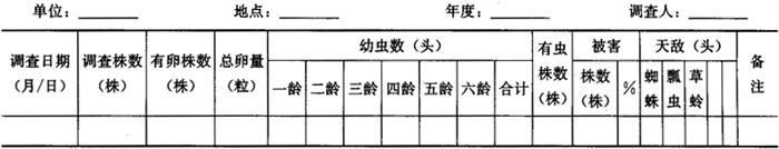 释义 | 花生棉铃虫测报调查方法 棉铃虫(Helicoverpa armigera)俗称青虫、钻桃虫等,属鳞翅目,夜蛾科。分布于全国棉区。在黄河流域棉区发生量大,为害较重。主要为害棉花,还为害花生、玉米、麦类、番茄等200多种植物。在花生田为害的棉铃虫,称为花生棉铃虫。 1 主要影响因子 1.1 温度 对花生棉铃虫最适宜的温度为25~28℃,相对湿度70%以上。第一代发生期间,气温的变化可直接影响羽化的迟早和产卵活动,第二代发生时,温度高,蛾量大。8~10月气温的变化影响秋季种群数量和越冬基数。秋季低温来临早,末代虫卵的孵化率和发生量降低。 1.2 降水 雨量影响土壤中蛹的存活率。雨量适中,分布均匀,没有旱象,对其发生有利。雨量较多,发生较轻,干旱年份,可能大发生。 1.3 天敌 卵和幼虫有天敌寄生。捕食性天敌如草蛉、长眼黄蜂等对其发生量有一定抑制作用。 1.4 生态条件 复种指数提高,作物种类增加,扩大了寄主范围。花生复种指数增加,间作、套种和条块种植,都有利该虫的越冬及繁殖。 2 调查项目和方法 2.1 成虫调查 2.1.1 黑光灯诱测 以20W黑光灯诱蛾,逐日调查蛾量,并区分雌、雄。结果记入棉铃虫成虫诱测记载表(表4-180)。 表4-180 棉铃虫成虫诱测记载表 2.1.2 杨树枝把诱蛾 一般用杨树树梢,以多带叶片为好,每10枝捆成一束,插立于花生田块行间,其高度要超出花生植株,每组插杨枝把10束,每天日出以前检查,分别雌雄蛾,逐日记载蛾量。调查结果记入表4-181。 表4-181 花生棉铃虫田间卵、幼虫、天敌和作物被害情况调查表 2.2 卵、幼虫和天敌调查 当黑光灯或杨树枝把诱到成虫以后,选2~3块有代表性的地块,每块田用对角线法取5~10个样点,每点单行调查20株,卵、幼虫多时调查株数可适当减少。调查采取定点、定株的方法,5~6天调查1次。每次将查到的卵用圆珠笔画圈标记,下次查卵时只统计未标记的新增卵,分别统计植株上卵粒、幼虫分龄期和天敌,以及被害植株和果实。结果记入花生棉铃虫田间卵、幼虫、天敌和作物被害情况调查表(表4-181)。 3 预测预报方法 综合分析法、期距预测法、模糊列联表法、分级统计法等。 4 预测预报参考资料 4.1 发生程度分级 ◆1级:百墩40~50头; ◆2级:百墩51~100头; ◆3级:百墩101~150头; ◆4级:百墩151~200头; ◆5级:百墩>200头。 4.2 防治指标 50头/百墩。 4.3 防治适期 7月中、下旬。 |