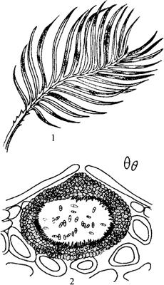释义 | 苏铁斑点病 【症状】 病害发生在叶片上。初出现为淡褐色小点,后逐渐扩大为圆形或不规则形的病斑。病斑直径1~5毫米,边缘红褐色,中央暗褐色至灰白色。后期在病斑上散生或聚生黑色小粒点,即病原菌分生孢子器。病害严重时,病斑可相互连接形成大斑,造成叶片上部枯死(图10-11)。 图10-11 苏铁斑点病 1.症状 2.分生孢子器及分生孢子 【病原】 苏铁壳二孢Ascochyta cycadina Scalia。分生孢子器球形或扁球形,暗褐色,直径100微米×239微米,突破表皮外露。分生孢子圆筒形或卵形,大小8.1~11.1微米×3.2~4.2微米。近无色或略带浅褐色,中央有1隔膜,隔膜处稍缢缩或无缢缩。 【发病规律】 病菌主要以分生孢子器或菌丝体在被害叶上越冬。次年形成分生孢子,借风雨传播蔓延。在广州地区5~11月均有发生,以8~9月发生较重。高温多雨利于害虫的发生。苏铁栽植在瘦瘠的粘质土壤中或将盆栽苏铁放于日光辐射强烈的水泥地上,都会加重病害的发生。病菌生长发育温度范围为0~35℃,最适温度为28℃左右。 【防治方法】 (1)加强栽培管理。宜选择土层深厚微带酸性砂质壤土种植。加强通风透光;新叶展开时,适当剪除下部老叶;适当增施有机肥,以增强树势,提高抗病力。 (2)发病初期可喷1∶1∶200波尔多液或75%百菌清可湿性粉剂600倍液,或50%甲基托布津可湿性粉剂800~1000倍液,每隔10天左右喷1次,喷药次数视病害情况发展而定。 |