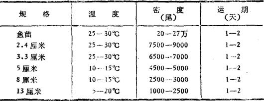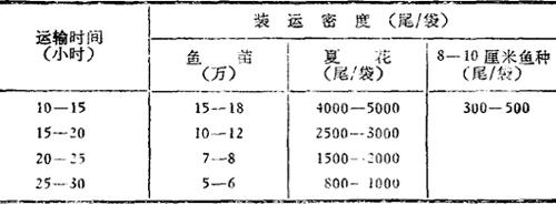 释义 | 苗种运输的方法 根据各自的交通特点选择适宜的运输方法,一般距离近或丘陵山区,交通不便的用肩挑,路远用汽车或火车,水路方便的可选用活水船或大型客货轮运输,具体的运输工具和方法有以下几种: (1)尼龙袋充氧密封运输 特点是体积小,使用携带方便,装运密度大,成活率高,适用各种交通工具。一次充氧能保持30个小时以上,是目前苗种运输中比较理想和广泛应用的一种方法。 常用的尼龙袋一般长70-80厘米,宽35-40厘米,容积约为20升左右,袋口突出约15厘米,宽10厘米,使用时将漏斗插入袋口,注入约1/3左右体积的水,过多不仅增加了运输重量,而且减少了充氧空间;过少,鱼的密度增大。加水后装进一定数量的苗种,把袋中空气挤出,同时用皮管从袋口充入氧气,然后将袋口折转用细绳或橡皮筋扎紧,平放于木箱或纸箱中,使尼龙袋的水和氧气有较大的接触面。装鱼密度应根据水温高低,苗种质量和运输时间来决定(表2-48)。 表2-48 尼龙袋充氧运输苗种密度表 使用尼龙袋运输应注意以下事项 ①尼龙袋在使用前应检查是否有破裂。 ②应轻拿轻放,平放于木箱和纸箱中,避免在地上拖摔或放在高低不平的地面上,以防破裂。 ③充氧要适中,一般以袋表面饱满有弹性为度,不能过于膨胀,以免温度升高或剧烈震动时破裂,特别是进行空运.充气更不宜多,以防高空气压低而引起破裂。 ④要准备几个空袋并冲氧气。运输途中应经常检查育无漏气漏水的地方,如有发生,要及时进行粘补或更换新袋。 (2)塑料桶充气密封运输 塑料桶运输是在尼龙袋运输的基础上改进的,优点是不易破损,不需包装,装卸方便,可重叠放置,使用方法简便,特别适用于道路崎岖不平,运输途中颠簸剧烈的地区。 塑料桶是用白色高压聚乙稀吹塑而成,一般长60厘米,阔40厘米,高12厘米软质盒状,形似加伦桶,容积约30公升,盒的上端有两个提手便于搬运,有一个直径5厘米的进出口及一个直径2.5厘米的注排气孔,孔内装有止道气门针,进出口及注排气孔均有揿压式内塞和螺栓外盖(形似自行车气咀的充气阀),使用时装水15公升,放鱼苗6万尾左右,充气10-12公升,运载时间不超过24小时,成活率可达95%以上。 (3)帆布桶(篓)运输 帆布桶便于进行换水喂食,因此常应用于汽车、火车、轮船上的长途运输,帆布桶有方形、圆形两种(图2-32),四周有木架或铁架支撑,体积1米3左右,也有大的。用后可以折叠,携带方便,经久耐用。使用时装水3/4,在水温20-25℃时装载密度如表2-49。 图2-32 运鱼工具 1.击水板;2.出水;3.巴箩;4.帆布桶 表2-49 帆布桶运输鱼种密度 运输途中要有专人管理,发现鱼浮头时要及时换水。换水时先用“出水”压入箱内吸出污水,然后再加入新水。途中无水可换时,可用木制的击水板击水,或用送气机送气以增加氧气。目前有的地方采用双氧水(H2O2)增氧的办法,效果也很好。其方法是每立方米水体加双氧水50毫升,先将双氧水倒入搪瓷盆内加清水稀释,然后缓缓均匀倒入鱼桶内,切勿倒入过猛和直接泼到鱼体上。双氧水不仅可增加氧气,而且还可以迅速氧化水中的污物,改善水质。 一般帆布桶(篓)用于汽车和火车运输上。 ①汽车运输。载重4吨的汽车,可装1立方米体积的小帆布桶或鱼篓4-6只,途中要经常击水增氧防止浮头死亡。 ②火车运输。30吨的车箱,可放小帆布箱15-20个。近年来,有的单位按每辆货运火车厢的长度和宽度设计成两只大的长方形帆布箱,装载量大大增加,而且管理方便成活率也高,目前已被广泛利用。为了便于途中清除污物和换水,在帆布箱靠车门的一边离底约15厘米处开一口径为12厘米的排水孔,孔的内侧装一防止鱼外逃的竹制套筒,外接帆布出水管,不出水时折叠扎紧。帆布箱四周上缘用绳吊挂在车箱壁,使整个箱体与车厢贴平。30吨的车厢除留出车门外,左右两侧各装一长4.2米、宽2.1米、高1.8米的大箱。装鱼苗时帆布箱内还应装一同等规格的密眼套箱,箱内盛水60-70%。每只帆布箱可装鱼苗250-300万尾,装夏花60-70万尾或10厘米左右鱼种30万尾。途中要日夜轮班击水增氧。吸污可用皮管或吸脚筒进行。 长途运输鱼苗不管采用什么方法途中都要喂食,一般在换水后两小时进行,喂后2-3小时吸一次沉积物,切忌不能在喂食后马上换水,否则会引起鱼苗大批死亡。体质差的鱼种在长途运输中也要适量投喂些面粉等精料。 (4)肩挑运输 运输距离较近,运输量不大和交通不便的丘陵山区采用肩挑运输。这种方法工具简便,成本低,但劳动强度大。一般用竹篓(内衬塑料布)或木桶。桶中装水2/3,不能太满以免泼出。挑运时要使桶水略有颠动以增加氧气。行程一天以内的,每担盛水20-25升,装载量如表2-50,表2-51。 表2-50 肩挑鱼篓鱼种运载密度 表2-51 小木桶装运鱼种密度 (5)活水船运输 在水路方便,水质良好的地区长途运输多采用这种方法,运输量大成活率高。 活水船的船舱前部和左右两侧有孔,孔上装有纱窗,船在河中前进时,河水自前孔流入舱内,从侧孔排出,使舱中水质新鲜,氧气充足。长约5厘米左右的舱,可装鱼苗600-1000万尾,夏花150-200万尾或8厘米规格鱼种50-70万尾,如鱼大应逐渐减少。活水船通过污水区时,应将进出水口暂时堵塞,以防污水进入舱内,并快速通过污水地段;若时间较久要采取人工送气或击水增氧。 运输途中应注意以下事项: ①长途运输,应选择孵出4天左右,鳔已充气(显腰点),体色较淡,体质健壮,游泳活泼的鱼苗;