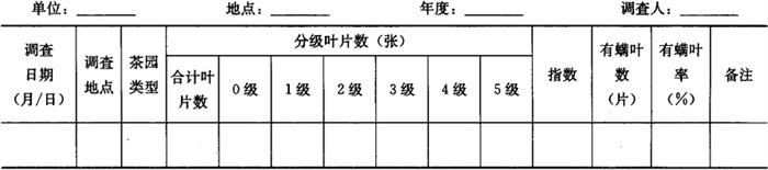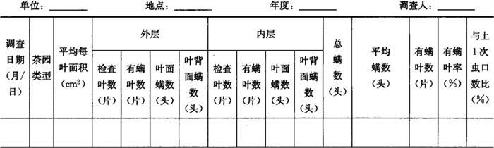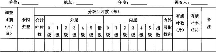 释义 | 茶橙瘿螨测报调查方法 茶橙瘿螨(Acaphylla theae Watt)是茶园中的主要害虫。国内茶区均有分布。该虫除为害茶树外,尚为害油茶、梨、檀、漆树及春蓼、一年蓬、星宿菜等多种林木、杂草。成螨和幼、若螨刺吸茶树汁液,螨量较多时,使被害叶呈现黄绿色,叶片主脉发红,叶片失去光泽;严重被害时,叶背出现褐色锈斑,芽叶萎缩、干枯,状似火烧,造成大量落叶,对茶叶产量、品质和树势均有严重的影响。由于此虫发生代数多,世代重叠,加之成、若螨虫体很小,肉眼难以察见,往往被忽略而致成灾。 1 调查内容和方法 1.1 越冬虫口密度调查 在11月中、下旬和翌年3月初各调查1次。选择不同类型茶园各3块,每块地均用平行跳跃法随机取样,一般不少于25个样点。每样点茶蓬内外层各取2张叶片(内层叶片指采摘面10cm以下),用放大镜检查虫数,并分级记入表8-47。 表8-47 茶橙瘿螨越冬虫口密度调查记载表 1.2 茶园虫口消长调查 每年3~8月,每天查1次;9~11月,每10天1次。选择有代表性的茶园(有条件的地方设置不喷化学农药的观察区),定点系统调查。检查面积不少于334m2。采用平行跳跃式随机多点取样,分别采内外层叶片各100张(采芽下二、三叶或对夹第二叶)带回室内。盛叶片不宜用塑料袋等密闭容器,也不能让叶片直接受光照射和过多挤压。用分级取样法各取25张叶片,用解剖镜检查全叶正、反面的成、若螨数,要求在3~4h查完,以免逃脱。虫口基数大时,取样叶片可适当减少。检查结果记入表8-48。 表8-48 茶橙瘿螨茶园虫口消长调查记载表 1.3 茶园虫口密度调查 当定点系统调查茶园螨量出现上升趋势时,开始调查,每5天查1次,至虫口开始下降时为止。选择不同类型茶园各3~5块,采用平行线跳跃多点取样(一般样点10个),每点取10张叶片(内外层叶片各5张),随取随用放大镜检查虫数。分级记入表8-49。 表8-49 茶橙瘿螨虫口密度普查记载表 2 预测方法 2.1 发生期预测 根据越冬虫口密度,定点虫口消长调查及大面积虫口密度普查,结合观察温度和雨量等天气情况,参照历年资料,预测发生高峰期。 2.2 发生趋势分析 当越冬虫口密度高,4月中旬以后少雨晴天多,第一虫口高峰将提早出现。当定点观察的虫口数不断增长,有虫率达50%,平均每叶有螨2头以上。同时,大面积普查有虫叶率达50%,有叶虫口指数1.4左右,此后两旬日均温20~27℃,旬雨量少于30mm时,即有大发生趋势。 3 发生程度分级 4 防治指标 每1cm2叶面积有虫3~4头,或指数值6~8。 叶面积计算公式: 叶面积=叶长×宽×0.7 |