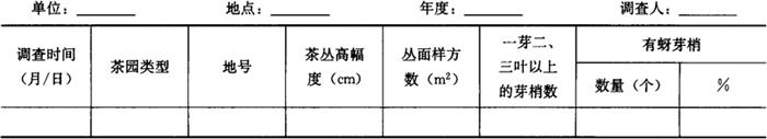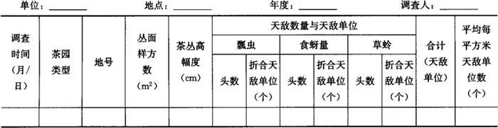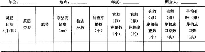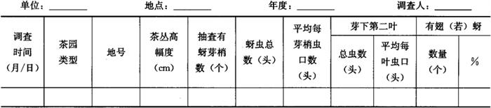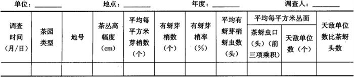 释义 | 茶蚜测报调查方法 茶蚜(Toxoptera aurantii Boyer)又名茶二叉蚜、可可蚜,俗称蜜虫、腻虫。国内各产茶省(自治区)均有发生,且以幼龄至开采前茶园受害较重。茶蚜聚集在新梢嫩叶背及嫩茎上刺吸汁液。受害芽叶萎缩,伸展停滞,甚至枯竭,其排泄的蜜露,可招致霉菌寄生;被害芽叶制成干茶色暗汤混浊,带腥味,对茶叶产量和品质均有严重的影响。 1 调查内容和方法 1.1 越冬虫口基数调查 冬季,按不同茶园类型,选择代表性茶园各二三块,采取平行线取样,每块地检查50~100丛,随机取10个秋梢,记载有蚜或蚜卵秋梢数,并统计有蚜(卵)秋梢率,尔后再从中抽取20或50个有蚜(卵)秋梢,检查虫口(卵)数,计算有蚜(卵)秋梢平均虫口,明确越冬虫口(卵)基数,一并记入表8-72。 表8-72 茶蚜越冬虫口基数调查记载表 1.2 早春存活虫口调查 当地春茶萌发后,日均温稳定达到10℃以上时,在越冬虫口基数调查地块,仍按相同方法取样,检查春茶芽叶上无翅蚜虫口,并按表8-73项目记载,为进一步调查虫口消长情况提供有效虫口基数。 表8-73 早春茶蚜虫口调查记载表 1.3 茶园虫口消长调查 在茶树春梢生长且大量出现一芽二、三叶时,开始系统调查。选定各类型代表性茶园各1块,每5天调查1次。按平行线取样,每一块地均匀抽查20丛,在丛面中央取1/3m2,检查一芽二、三叶以上的芽梢数及其有蚜芽梢数,统计有蚜芽梢率,记入表8-74。再在每样方内,随机抽查有蚜芽梢5个,共100个,记载总蚜数,芽下第二叶蚜虫数及其有翅蚜(包括有翅若蚜)数量,计算有蚜芽梢的芽下第二叶平均虫口和有翅蚜百分率,记入表8-75,为进一步分析虫情提供依据。采摘茶园宜结合采摘,穿插进行虫情调查。 表8-74 茶蚜系统调查表 表8-75 茶蚜系统调查表 1.4 茶蚜天敌调查 结合茶园虫口消长调查,记载丛面样方内出现的天敌种类、数量,并按下列式订标准折算成天敌单位,计算平均每1/3m2样方天敌单位数,记入表8-76。再运用表8-75的平均芽梢虫口数,求出天敌单位与茶蚜数量之比,记入表8-77,以估计天敌控制趋势。 表8-76 茶蚜天敌调查记载表 表8-77 茶蚜天敌益害比统计表 茶蚜天敌折算标准(试行): 1头异色瓢虫(成虫或幼虫)=1个天敌单位 1头龟纹瓢虫(成虫或幼虫)=0.8个天敌单位 1头刀角瓢虫等小瓢虫=0.5个天敌单位 1头草蛉幼虫=0.8个天敌单位 1头食蚜蝇幼虫=0.5个天敌单位 2 预测预报方法 春茶季节,气候适宜,芽叶生长旺盛持嫩,最利茶蚜发生。加之此时天敌尚少,常易酿成蚜害。当有蚜芽梢率达10%,有蚜芽梢芽下第二叶平均虫口达20%头以上时,即为防治适期,应及时预报。幼龄茶园及封养非采摘茶园,一般更应注意。 春茶以后,根据芽梢生长、采摘、天气情况和天敌单位与蚜虫数量之比达1∶300,即使达到上述指标,亦可考虑不防治。 3 防治指标 有蚜芽梢率4%~5%,芽下二叶有蚜叶上平均虫口20头。 |