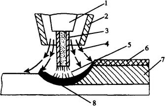 图6-5 药芯焊丝气体保护焊示意图 1-导电嘴;2-喷嘴;3-药芯焊丝;4-CO2气体;5-电弧;6-熔渣;7-焊缝;8-熔池 药芯焊丝是综合焊条和实芯焊丝的优点而成的高效高性能的焊接材料。它的优点是:①效率高,药芯焊丝的熔敷速度远远高于手工焊条,与实芯焊丝相比也略胜一筹。药芯焊丝能与实芯焊丝一样能实现半自动化和自动化焊接,有效焊接时间大大提高。②焊接工艺性好,由于焊丝芯部焊药加有稳弧剂、渣剂和合金粉,从而使电弧燃烧稳定,熔滴过渡平稳、飞溅小、焊缝成型美观,也提高全位置焊接的适应性。③可以调整药芯的合金成分调节熔敷金属的化学成分,满足不同的要求。 目前,药芯焊丝气体保护焊焊接不锈钢通常采用手工操作焊接方法,有时也可采用机械化焊接。保护气体一般采用CO2气体,有时也采用CO2中添加少量的Ar气的混合气体。焊接设备与普通实芯焊丝CO2焊相同。 药芯焊丝气保护焊接的焊接参数主要有焊接电流、电弧电压、焊接速度、焊丝伸出长度和保护气体流量。当其他条件不变的情况下,焊接电流与送丝速度成正比。上述任何一个参数的变化都影响到焊接工艺性能,药芯丝焊的生产厂家一般会提供合适参数供用户参考。 |