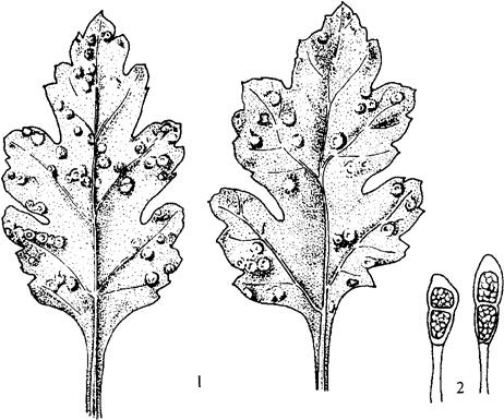 释义 | 菊花锈病 【症状】 白锈病(图5-1)首先在叶背面产生很小的变色斑,然后隆起呈灰白色的脓疱状,渐渐变为淡褐色,叶正面则为淡黄色的斑点,且轻微凹陷。圆形病斑直径2.5~5.0毫米,严重时整叶布满病斑,导致早期枯死。 图5-1 菊花锈病 1.为害状 2.冬孢子 黑锈病即常说的菊花锈病。在叶片的正反两面均可看到浅黄色的斑点。而后在叶背形成黑褐色的粉疱状突起,随后又在原有的疱状突起外围生出1圈又1圈的次生疱。受害叶片最后枯萎。在萼片上,有时也会受到为害,但茎杆上未见到。 褐锈病与前两种菊花锈病不同的是孢子堆仅着生在叶片正面,且颜色为橙黄褐色。 【病原】 白锈病病原菌为掘氏菊柄锈菌Puccinia horiana P.Henn。冬孢子堆生于叶背,直径2~5微米,冬孢子长椭圆形,30~52微米×11~17微米,黄褐色,双细胞,顶圆或尖,柄无色或淡黄色,柄长50微米。 黑锈病病原菌P.chrysanthemi Roze 夏孢子近圆形,30~37微米×25~32微米,黄褐色,有刺;冬孢子倒卵形至椭圆形,38~55微米×23~32微米,栗褐色,双细胞,柄无色,柄长90微米。 褐锈病原菌为蒿多层锈菌Phakopsora artemisiae Hirat 夏孢子卵圆或椭圆形,着生子叶正面,大小23.5~36微米×16~25微米,有刺,淡黄色;冬孢子堆生于叶背面,3~5层,长椭圆形或方形,大小为19.5~32.5微米×18微米,色黄至深褐,寄生蒿属、紫苑属、菊属和洋兰属等植物上。 【发病规律】 夏孢子萌发侵染温度为16~27℃,低于6℃或高于31℃时,不能侵染。叶片上水膜是孢子萌芽的必要条件。 【防治方法】 (1)栽培防病。清出病残体,选择肥沃深厚的土壤。保持植物地上部经常干燥。选健康母株作繁殖材料。 (2)药剂防治。可用12.5%烯唑醇可湿性粉剂3000倍液,或20%粉锈宁乳油2000~4000倍液,每隔10~15天喷1次,连续喷2~3次。 |