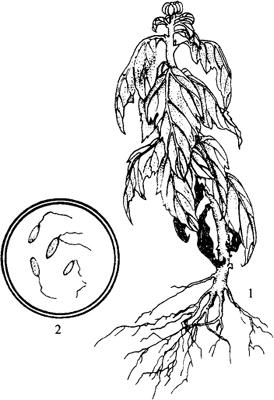 【症状】 此病系细菌侵染植株根部、茎引起的维管束病害。幼苗期感病,通常地上部分叶片突然失水干枯下垂,根部变褐腐烂,最后整株枯死。用刀横切茎或根,可见白色或黄褐色细菌粘液(图5-8)。