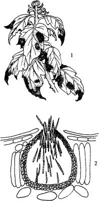 释义 | 菊花黑斑病 【症状】 发病初期在叶片上出现褐色小点,圆形或椭圆形、大小不一的紫褐色病斑,后变深褐至黑色,直径2~10毫米。病部与健部界限明显,后期病斑中心转浅灰色,病斑与病斑相互连接成大斑块,叶片变黑枯死。一般发病从植株下部叶片开始,顺次向上枯死。发黑干枯叶片并不脱落,病部出现不明显小黑点。 【病原】 菊花黑斑病原菌为Septoria chrysanthemella Sacc。分生孢子器球形,顶部有孔口,直径70~136微米,褐色至黑色。分生孢子梗短。分生孢子细长,丝状,无色,有隔膜4~9个。 【发病规律】 病菌以菌丝和分生孢子器在病株上越冬。翌年温度适宜时,分生孢子器于降雨后溢出大量分生孢子,借风雨传播。病菌发育最适温度为24~28℃。秋季多雨发病严重。病菌侵入植株后20~30天开始发病。不同品种抗性不一。感病品种有新大白、香白梨、西施醉舞、火舞、紫蝴蝶、蟹爪黄等。抗病品种有迎春舞、秋色、玉桃、紫桂、湖上月等。 【防治方法】 (1)园艺防治。冬季深耕将病叶埋入土中,轮栽。加强田园管理,施肥注意氮、磷、钾配合,促使植株生长健壮。发现病叶,立即摘除。开花后割去地上部分,集中病残株烧毁。注意选好品种。栽地通风透光。 (2)药物防治。发病初摘去病叶,喷50%多菌灵500倍液,或50%代森铵600~800倍液,或75%百菌清500倍液,每隔7~10天喷1次,连续喷3~4次。 图5-7 菊花黑斑病 1.症状 2.分生孢子器及分生孢子 |