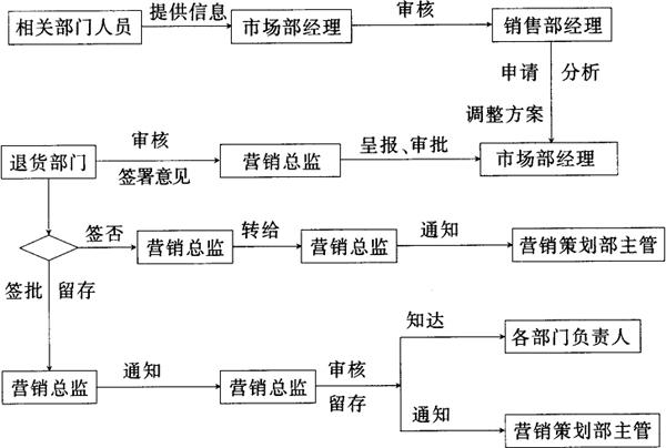 4.市场部经理根据所得到的信息对营销方案进行审核,并要求营销策划部主管对信息进行整理、分析以及制定出营销调整方案,再转交给市场部经理进行审核。