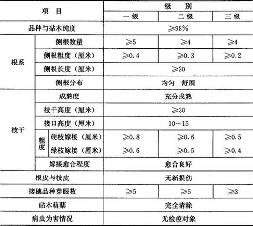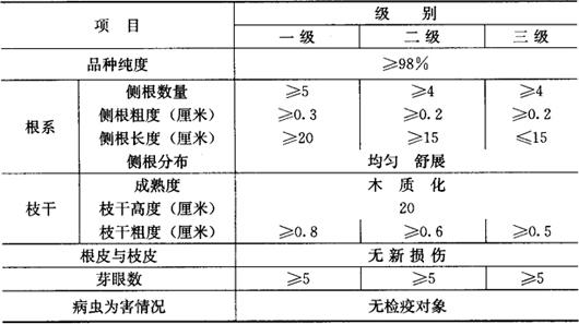 释义 | 葡萄苗木的选择 葡萄苗木是葡萄生产的最基本的生产资料。苗木的质量好坏直接影响着葡萄园进入结果期的早晚和果农的经济效益。在所有的果树当中,葡萄是最易繁殖的树种之一。常用的苗木有扦插苗、嫁接苗、压条苗、营养钵苗等。但我们建议根据当地的土壤和气候条件选用具有相应抗性的无病虫害的粗壮嫁接苗。葡萄苗木的质量标准见表3和表4。 表3 葡萄自根苗质量标准 表4 葡萄嫁接苗质量标准 |