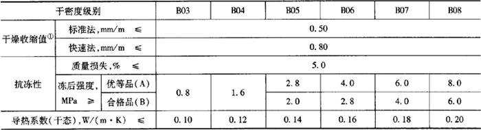 表3-130 蒸压加气混凝土砌块的干燥收缩、抗冻性和导热系数