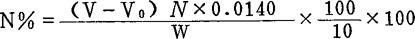 式中:V——样品测定消耗的硫酸标准液毫升数; V0——空白试验消耗的硫酸标准液毫升数; N——硫酸标准液的当量浓度; W——样品称量重(g); |